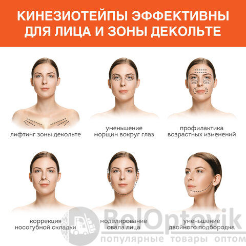 Кинезиотейпы DASWERK подходят для тейпирования лица и тела. В спорте они используются для cнижения болевых ощущений при травмах, а в эстетической косметологии - для моделирования овала лица, разглаживания возрастных и мимических морщин и т.д.