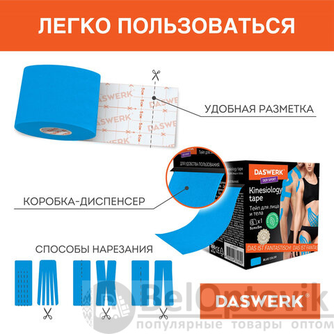 Кинезиотейпы DASWERK подходят для тейпирования любых участков тела. В фитнесе и спорте они используются для предотвращения повреждений и cнижения болевых ощущений во время реабилитации с последующим полным восстановлением, а в эстетической косметологии - для моделирования овала лица, разглаживания возрастных и мимических морщин, восстановления эластичности кожи, улучшения микроциркуляции и кровоснабжения тканей лица. Кинезиотейп на 95% состоит из хлопка, что снижает риск возникновения аллергических реакций.