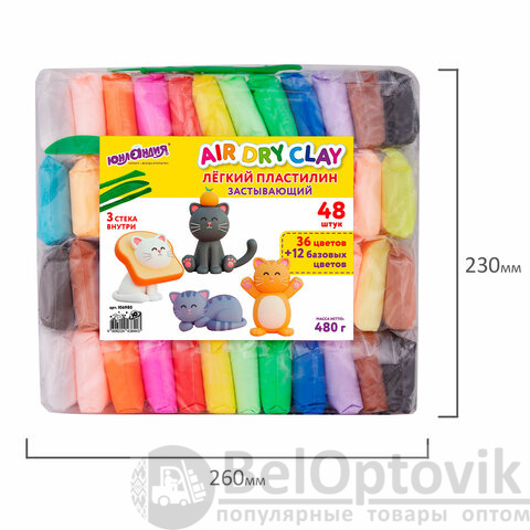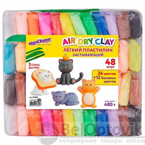 Набор состоит из суперлёгкого воздушного пластилина высокого качества и стеков, вносящих разнообразие в занятие лепкой. 48 цветов позволят ребенку создать действительно уникальную поделку, миниатюрную скульптуру или картину. Чтобы поделка застыла ее необходимо оставить на открытом воздухе.