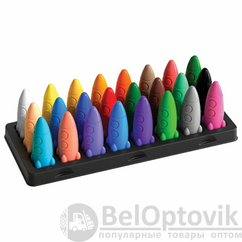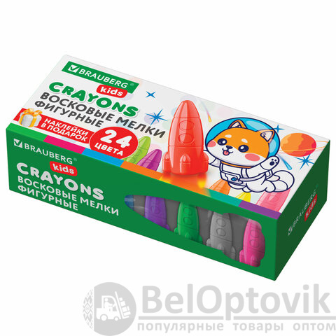 Восковые мелки фигурные BRAUBERG KIDS "РАКЕТА", НАБОР 24 цвета + НАКЛЕЙКИ В ПОДАРОК!, 273083