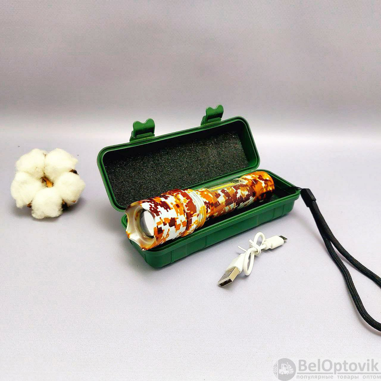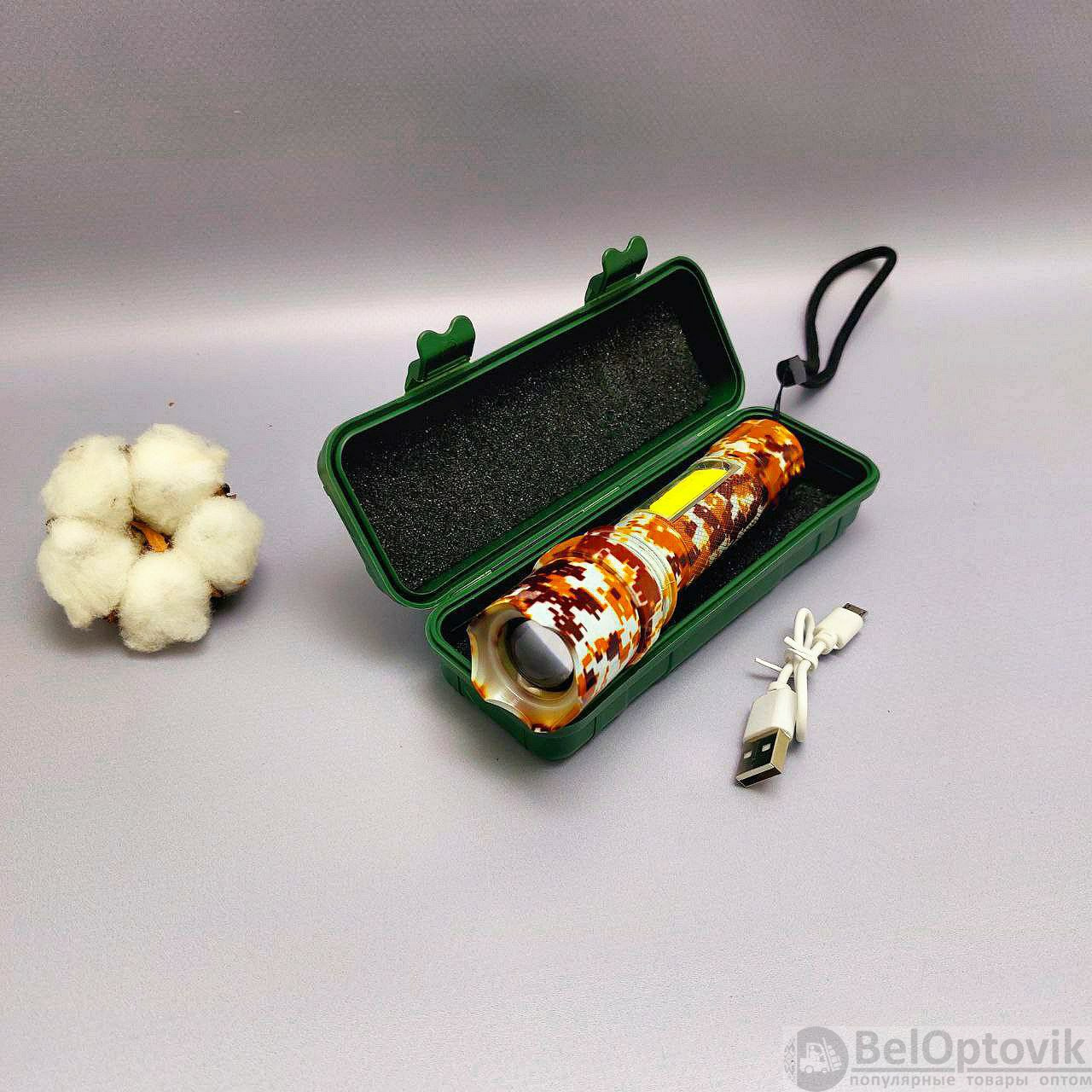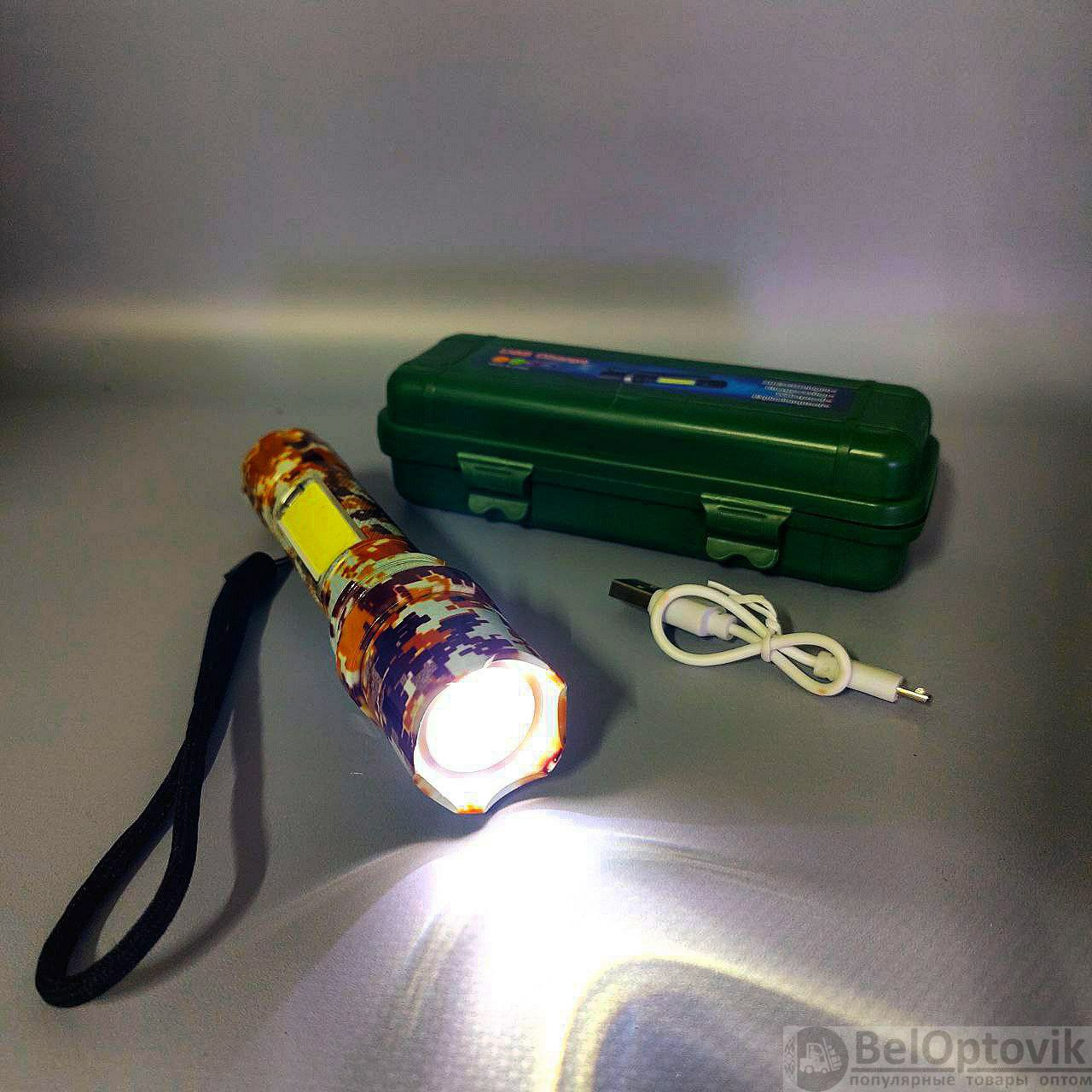 Фонарь электрический светодиодный аккумуляторный с фокусировкой луча и боковой подсветкой XPE+COB (microusb+водонепроницаемый пластиковый бокс)
