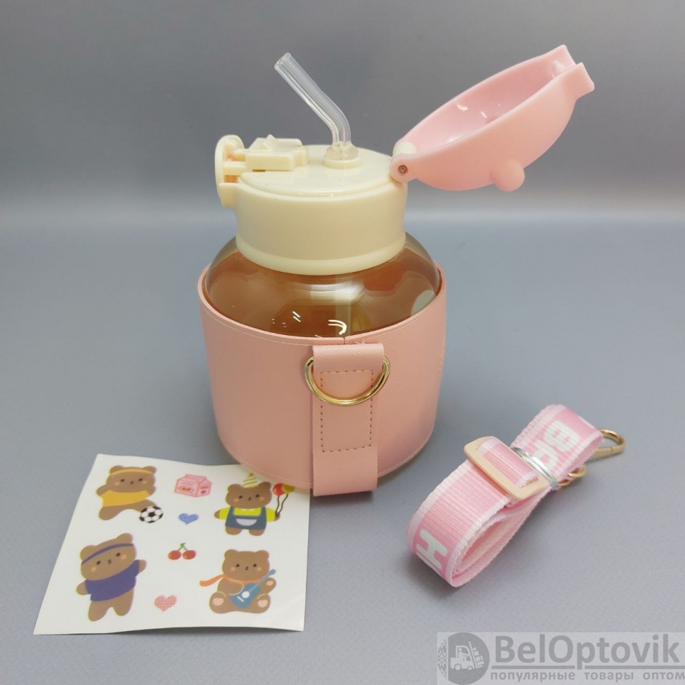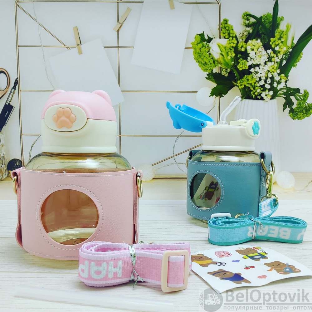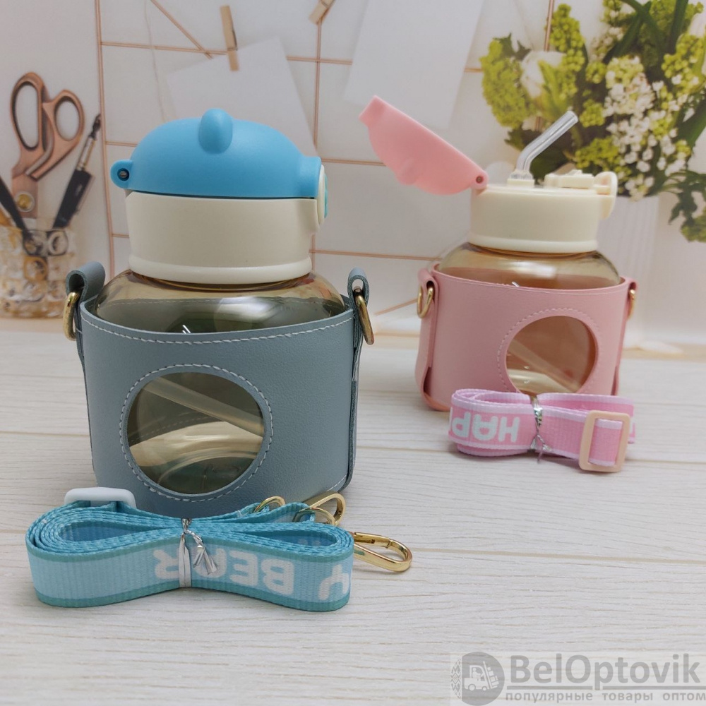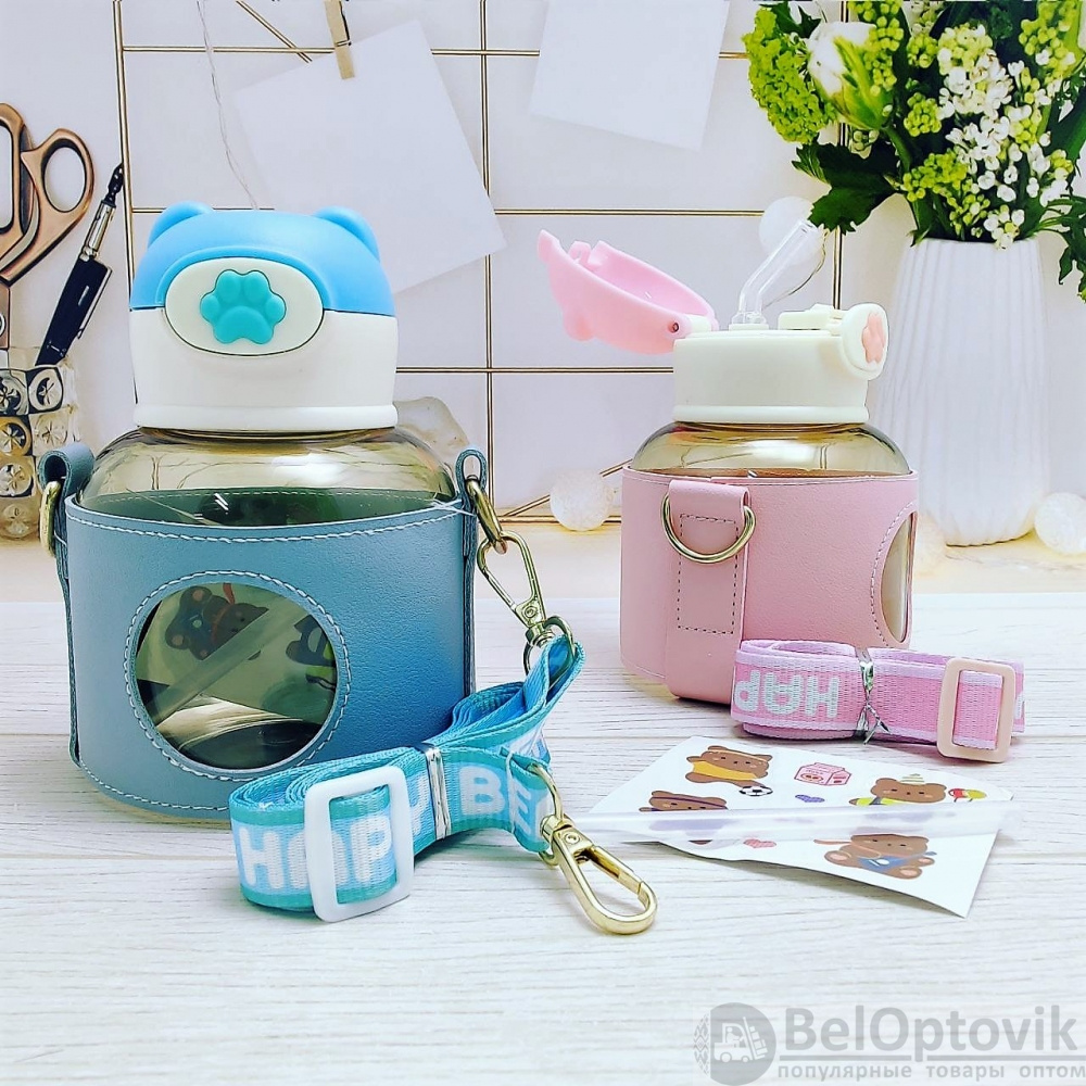 Бутылка "Мишка" в чехле с клапаном, трубочкой и ремешком 550 мл. / Наклейки в подарок!