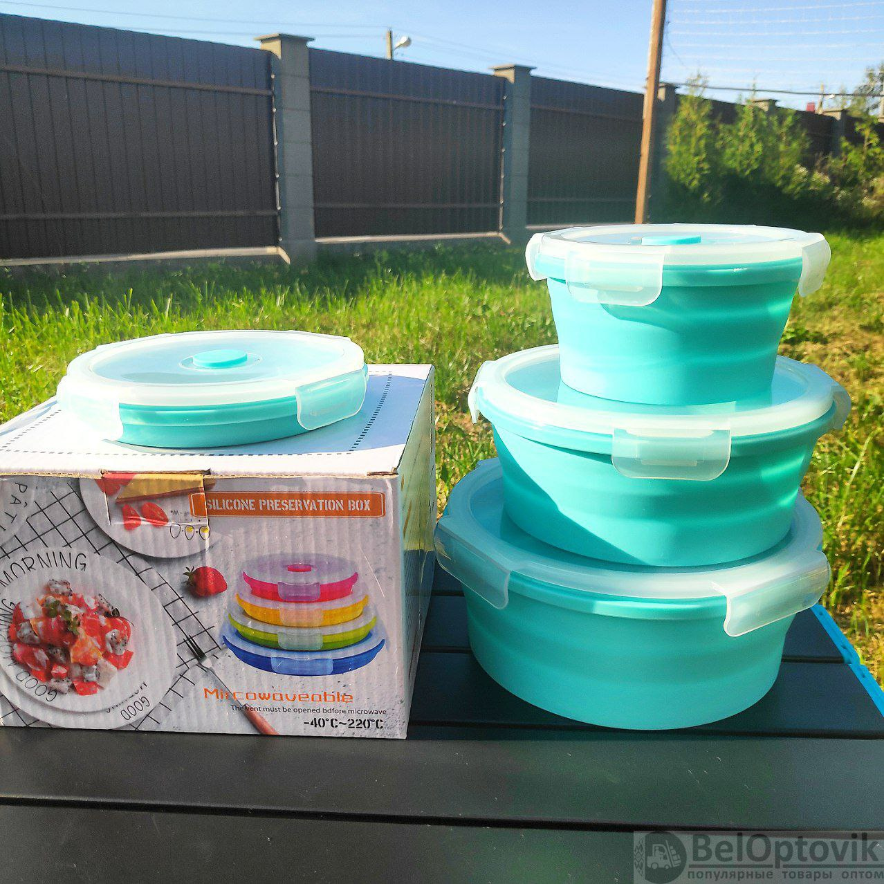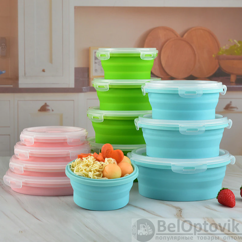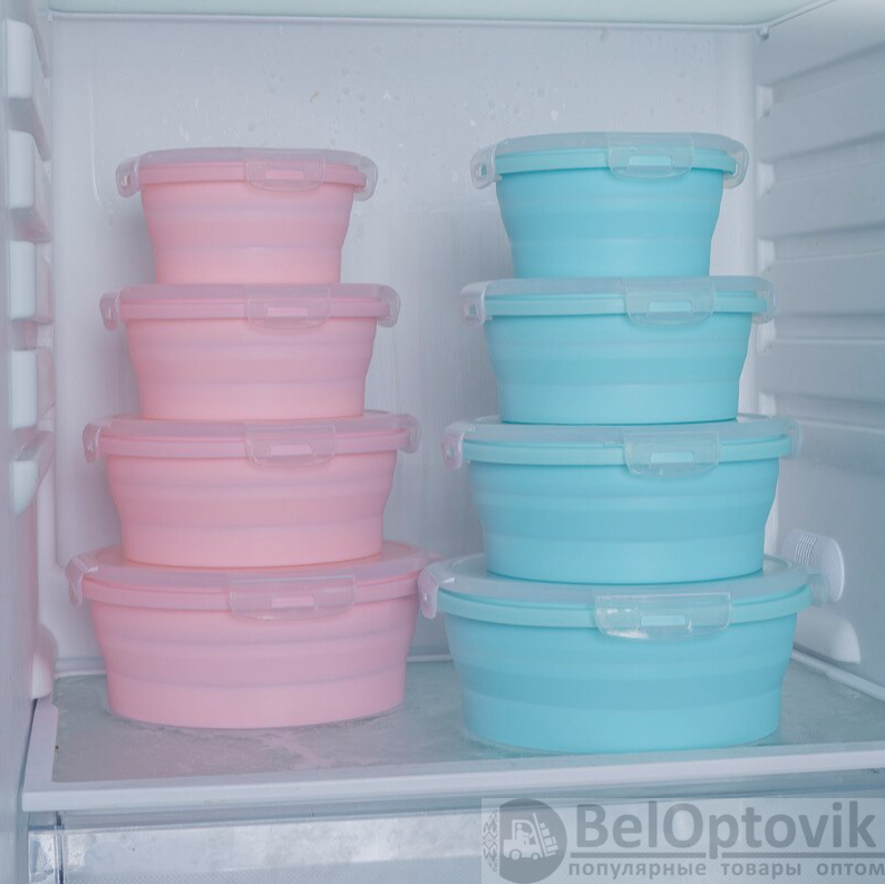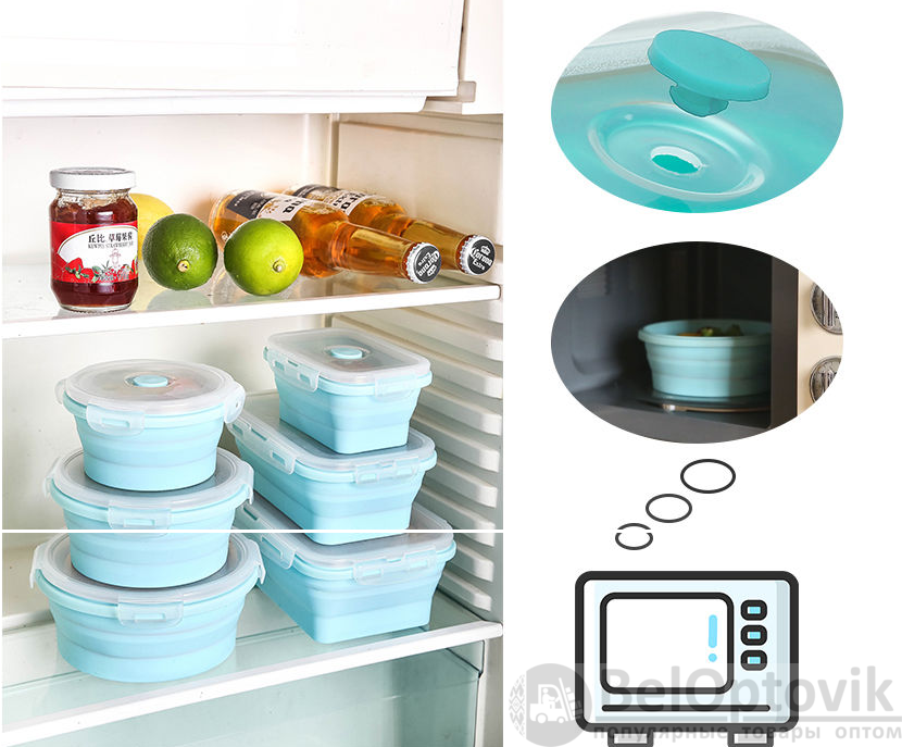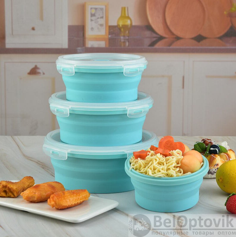 Набор силиконовых складных контейнеров подходит для хранения продуктов и еды, для переноски завтраков (обедов, ужина), транспортировки готовой еды, хранения продуктов в холодильнике или морозильной камере (морозильнике), для подогрева еды в микроволной печи и мойки в посудомоечной машине.