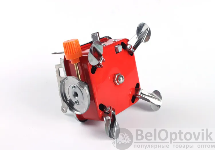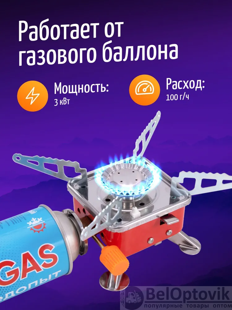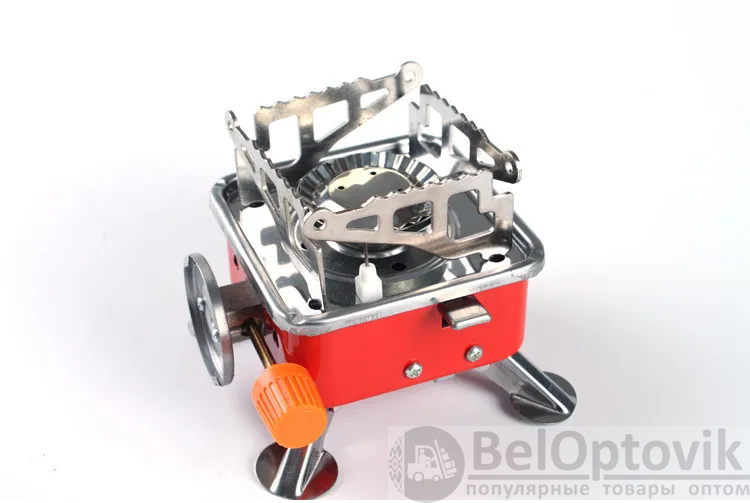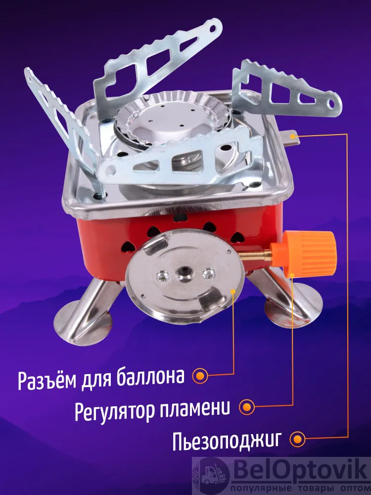 Корпус изготовлен из качественного металла. Разъем для подключения баллона расположен на стороне корпуса. На одной из боковых сторон расположен рычаг для включения пьезоэлемента и регулятор подачи газа. Плавная регулировка мощности горения. Внизу газовой плиты находятся складные ножки. Рекомендуется использовать в качестве индивидуальной портативной плиты для 3 или 4-х человек. Внимание! Перед установкой баллона следует перекрыть газовый вентиль горелки!