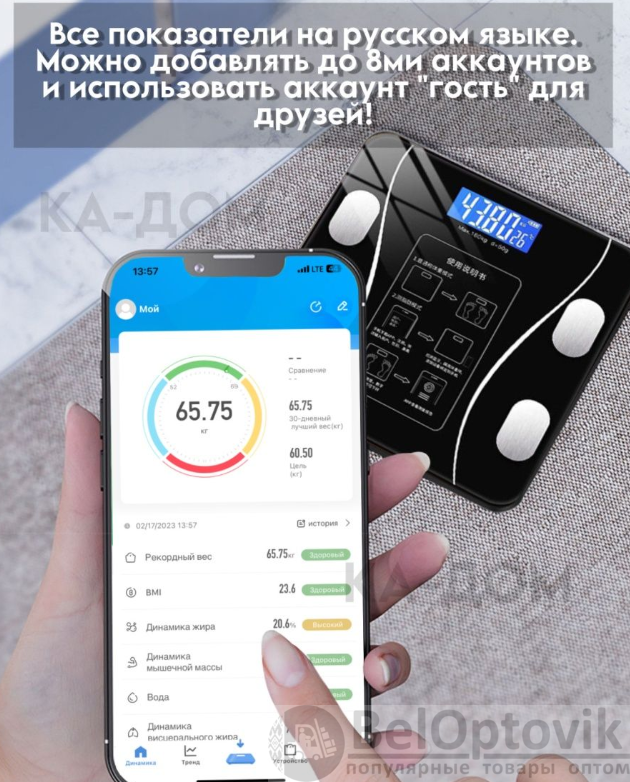 Если у Вас есть умные весы с 4 чувствительными датчиками давления и встроенным термометром для высокоточной диагностики веса, объемов, здоровья- Вы сможете ежедневно узнавать и отслеживать за своим здоровьем по 12 показателям! В вашем распоряжении будут точнейшие данные сразу по 12 показателям – 100% контроль над состоянием организма. Узнайте все о своем теле за 1 раз! Обладая всесторонней картиной о состоянии здоровья, гораздо проще корректировать образ жизни и систему питания, подбирать оптимальные нагрузки.
