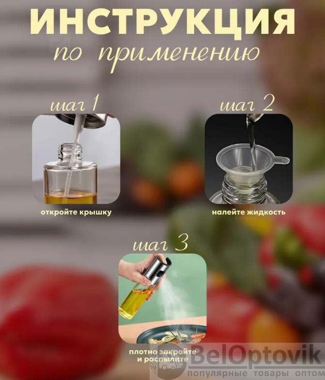 Купить бутылку с распылителем для масла и уксуса (кухонный диспенсер, спрей), 100 мл на нашем сайте можно ОПТОМ от 20 шт. или не менее 5, если Вы покупаете у нас и другие товары (сборный заказ).