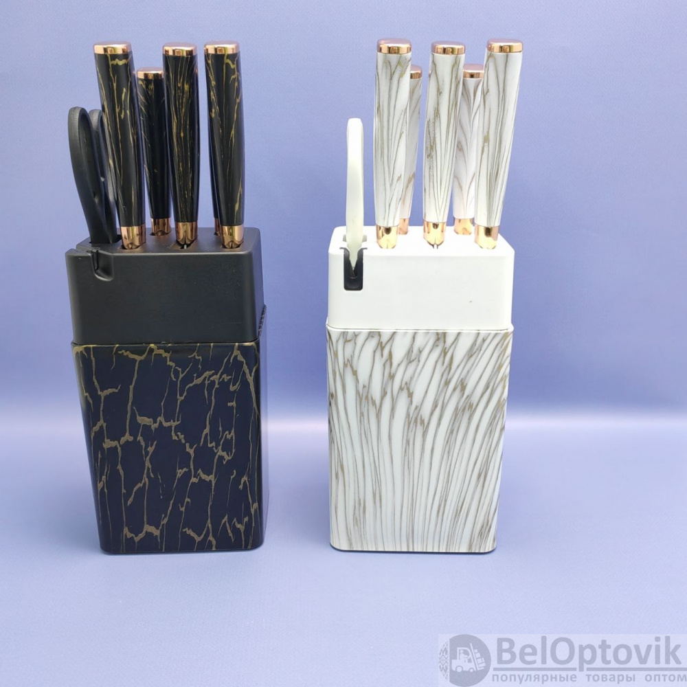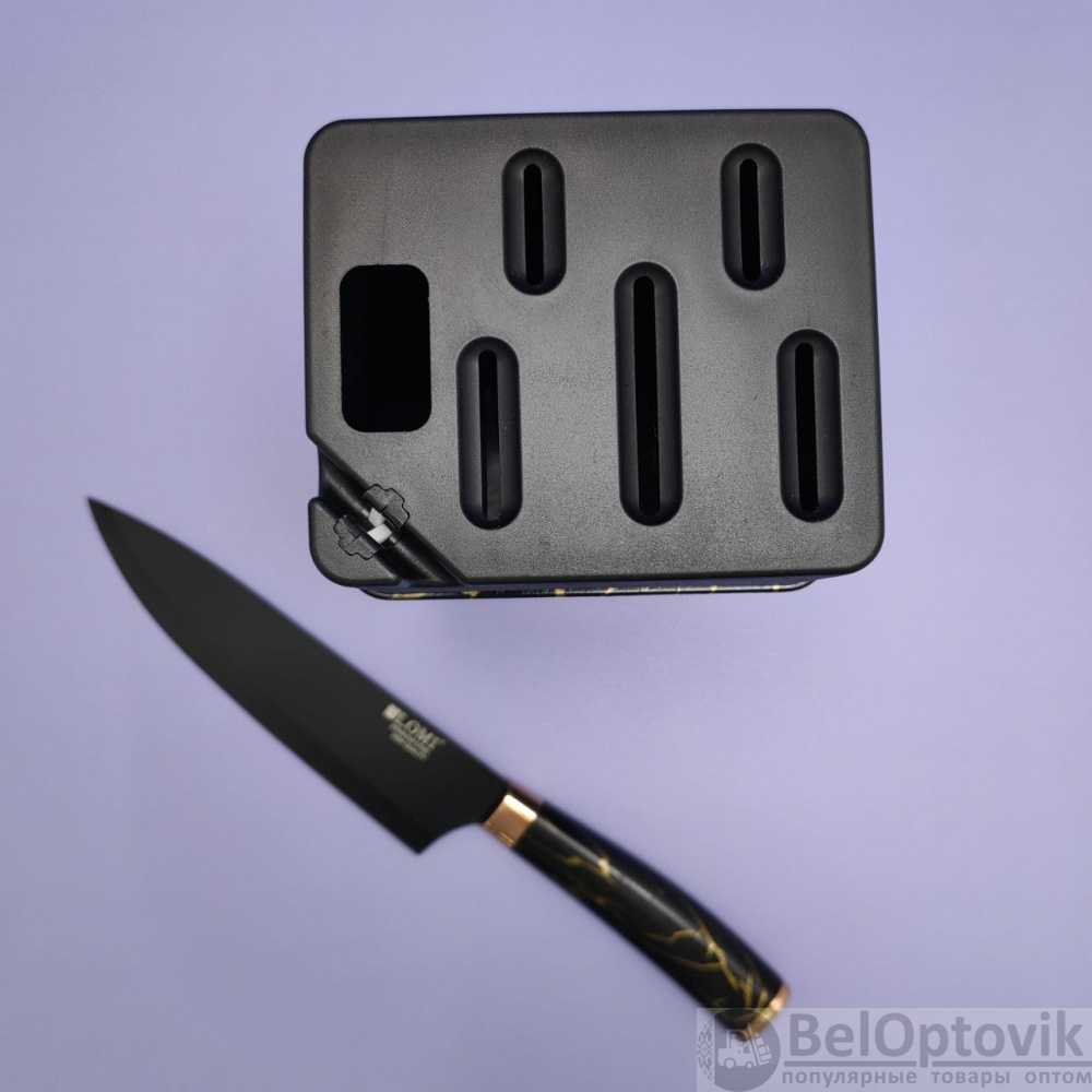Набор ножей кухонных компактно размещается на оригинальной прямоугольной подставке с гнездами для определенного ножа. Подставка выглядит очень стильно и оригинально. На ней найдется место для всего комплекта ножей!