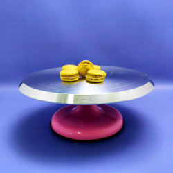 В настоящее время незаменимым помощником на кухне дома и в кондитерской является подставка с эффектом вращения. Многие женщины любят печь торты самостоятельно, но заниматься его украшением не всегда удобно. С ее помощью вы можете не только задекорировать и украсить выпечку, но и эффектно подать десерт к праздничному столу. Она идеальна для фуршетов и торжественных мероприятий. У каждого, даже начинающего кондитера должна быть в арсенале вращающаяся подставка для торта. Она представляет из себя поворотный гладкий круглый поднос из нержавеющей стали диаметром 30,50 сантиметров на изящной ножке которая установлена на резиновом нескользящем покрытии в основе которого лежит крутящий элемент.