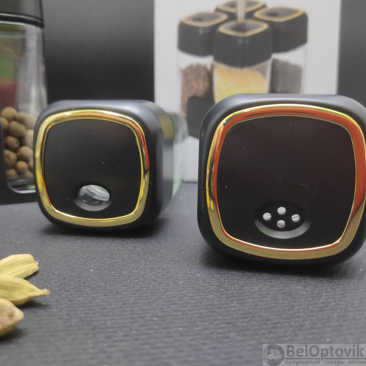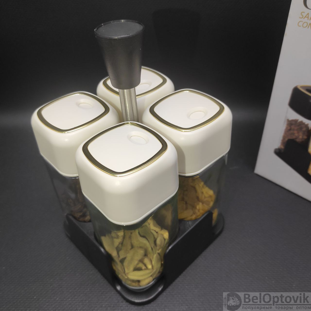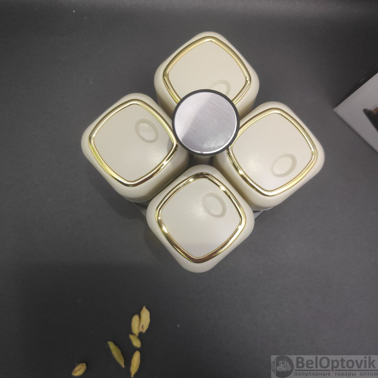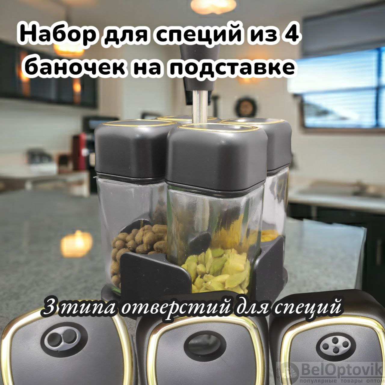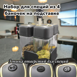 Красота, стиль, качество, удобство и функциональность - все это включает в себя набор для специи на подставке. Баночки для специй в наборе для специй выполнены из прочного бессвинцового стекла. Подставка сделана из безопасного ABS пластика и нержавеющей стали. В набор входят 4 баночки для специй, в каждой крышке баночки 3 режима дозирования- мелкое (четыре дырочки для высыпания специй), среднее (две дырочки) и крупное (одна большая дырочка).