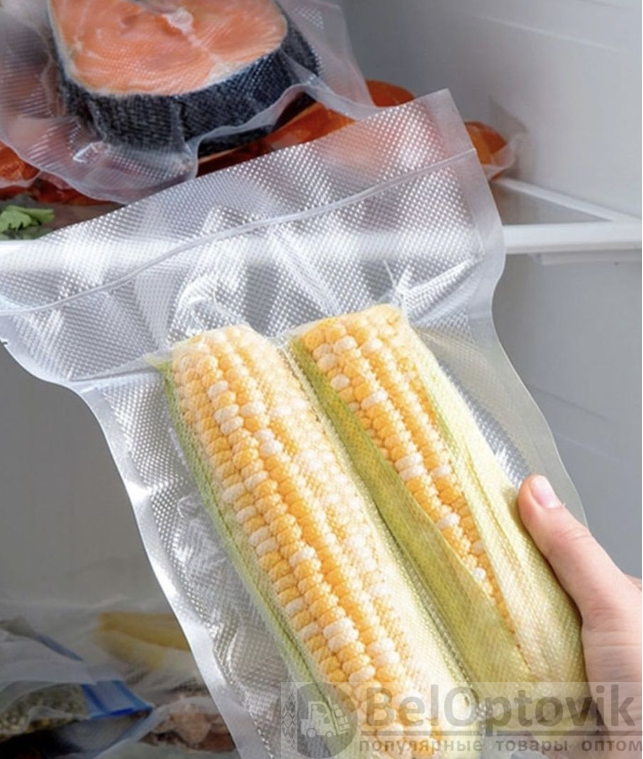 Еду можно упаковывать сразу после приготовления и хранить в морозилке или холодильнике, не подвергая заморозке. Такой способ хранения идеален для замороженных овощных нарезок, мяса, рыбы, птицы или полуфабрикатов. Вакууматор с запайкой идеально подходит для людей, предпочитающих вегетарианскую и диетическую пищу, а также для хранения детской еды. Упаковочный аксессуар использует в своей работе обычные многоразовые полиэтиленовые пакеты. В наборе с полезным приспособлением идут 5 штук продуктовых пакетиков 17 х 25 см.