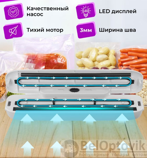 Вакуумный упаковщик - это кухонная бытовая техника, помогающая продлить срок хранения продуктов питания и готовых блюд. Девайс позволяет готовить пищу по технологии су - вид (сувид). Полуавтоматический ручной вакуумный упаковщик с мощностью всасывания 90 Вт имеет 2 режима работы - режим вакуумирования и запайки, режим запайки. Вакуумный запайщик обладает функцией внешней откачки воздуха, что позволяет Вам использовать специальные контейнеры, мешки, которые держат вакуум, для хранения продуктов. Длина запайки составляет 30 см, а ширина шва - 2 мм. Машинка для вакуумирования подходит для герметизации всех видов продуктов - сухих, влажных, порошкообразных, твердых и мягких, а также для различных мелочей. Вы сможете использовать вакуумную машину полу автомат для упаковки свежих овощей и фруктов, чая, сладостей и кондитерских изделий, мяса, курицы, грибов, кукурузы, а также под крупы, ягоды и орехи. Срок хранения пищи в вакуумной упаковке увеличивается в 5 раз! Упакованную таким образом еду можно хранить в холодильнике или замораживать в морозильной камере.