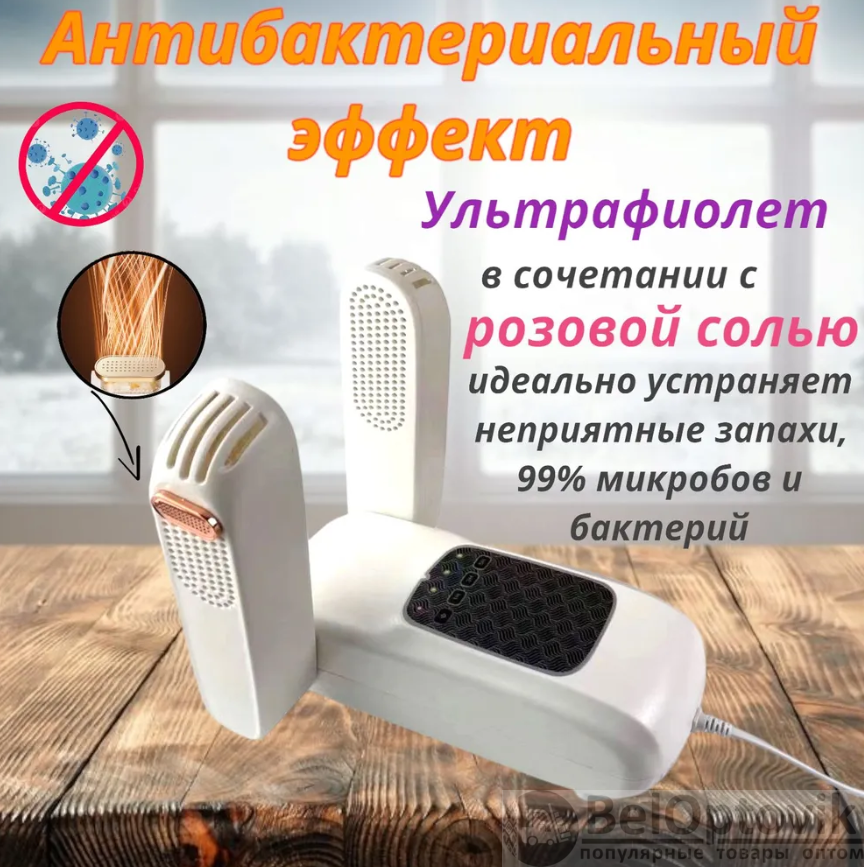 Электросушилка излучает ультрафиолетовый свет, который эффективно уничтожает бактерии и микробы. Специальные отсеки с розовой солью впитывают лишнюю влагу, борются с возникновением грибка и способствуют устранению запаха.
