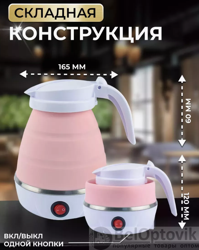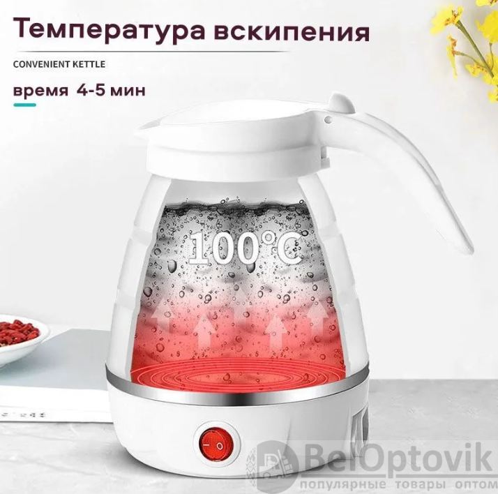 Силиконовый складной электрический чайник, современное решение, которое станет отличной альтернативой обычному чайнику или водонагревателю, в поездках, благодаря своей компактности, надёжности и удобной конструкции. Выполнен из прочного пластика, качественного и безвредного жаростойкого пищевого силикона, который не впитывает посторонние запахи. Ударопрочный материал, из которого выполнен силиконовый миничайник не позволит ему разбиться в поездках. В сложенном состоянии имеет габариты: 132ммх97ммх182мм, где 97мм это высота в сложенном состоянии. Высота чайника в разложенном виде всего 172 мм. Туристический чайник имеет мощность 600 Вт.
