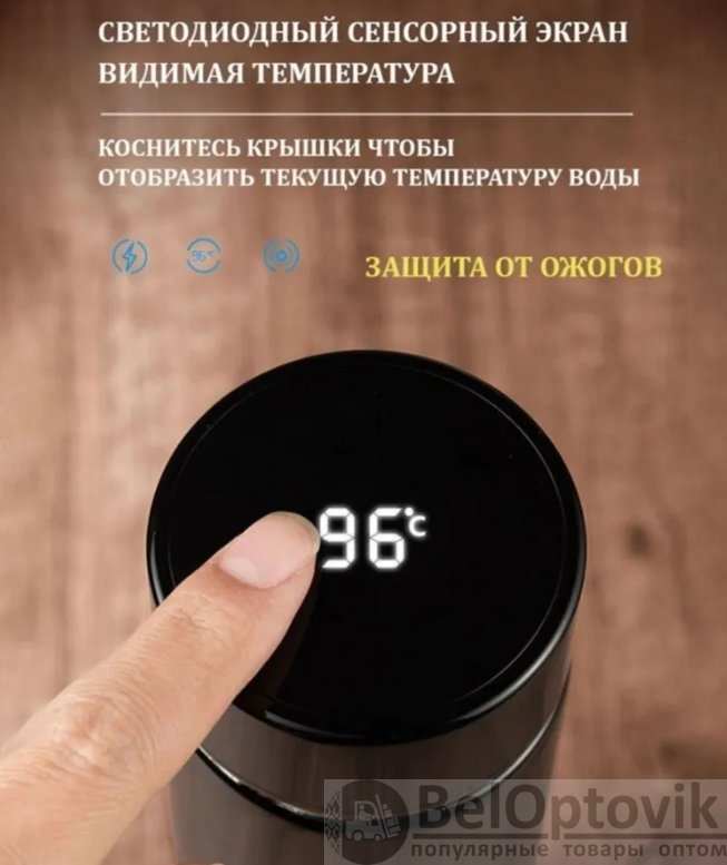 Термос изготовлен из прочной нержавеющей стали. Термос не только сохраняет Ваши напитки горячими, но и показывает насколько они горячие. Уникальная особенность термоса - это сенсорный индикатор температуры, расположенный в крышке. Согласитесь, что довольно удобно знать температуру содержимого термоса, не открывая его. Чтобы узнать температуру внутри термоса, достаточно прикоснуться к поверхности крышки. Встроенный умный чип позволяет экономить заряд, поэтому хватит на весь срок работы термоса. Внутренняя колба изготовлена из высококачественной стали марки SUS 304, что делает термос устойчивым к коррозии. Крышка термоса с внутренней стороны имеет силиконовое кольцо для более плотной изоляции. Для удобства заварки чая непосредственно в термосе предусмотрено съемное ситечко. Размер отверстий вполне подходит для фильтрации мелколистового чая.
