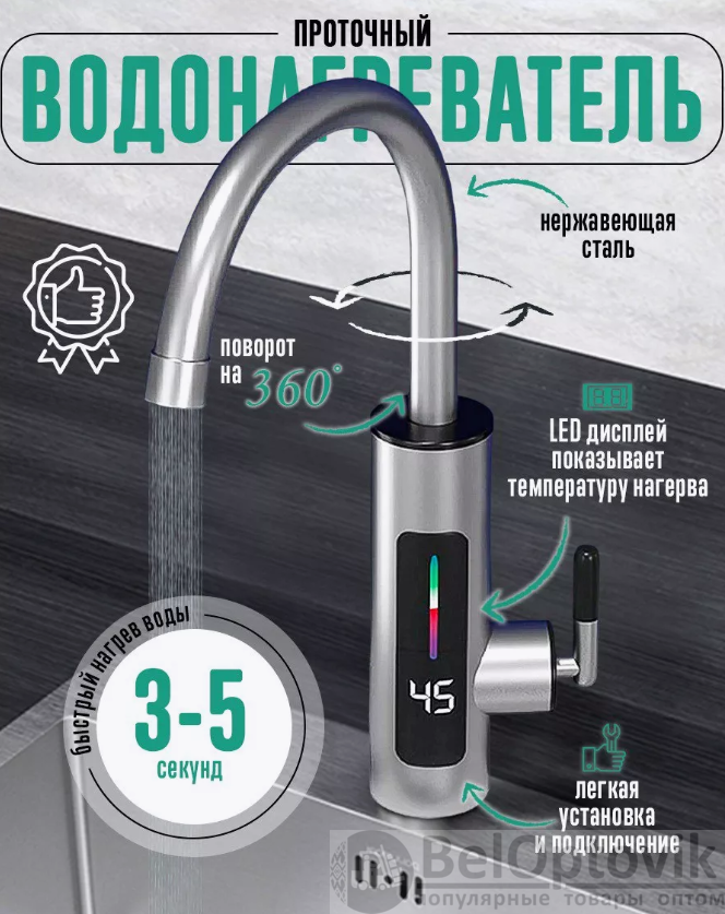 Превосходный водонагреватель проточный кран с электрическим LED дисплеем - это идеальное решение для вашей кухни или ванной комнаты. Благодаря современному дизайну и функциональности этот кран обеспечит вам быстрое и удобное получение горячей воды в любое время. Электрический водонагреватель имеет компактные размеры, что позволяет установить его даже в небольших помещениях. LED дисплей отображает текущую температуру воды, что делает использование крана еще более удобным и практичным. Благодаря современным технологиям он также экономичен в потреблении электроэнергии, что позволит вам сэкономить на коммунальных платежах. Водонагреватель прост в установке и обслуживании, что делает его идеальным выбором для дома или офиса. Проточный электрический водонагреватель на кран - это удобное и эффективное решение. Кроме того, этот водонагреватель экономичен в использовании, так как не требует предварительного нагрева большого объема воды. Вы платите только за ту воду, которую реально используете, что делает его идеальным выбором для тех, кто заботится о своем бюджете.