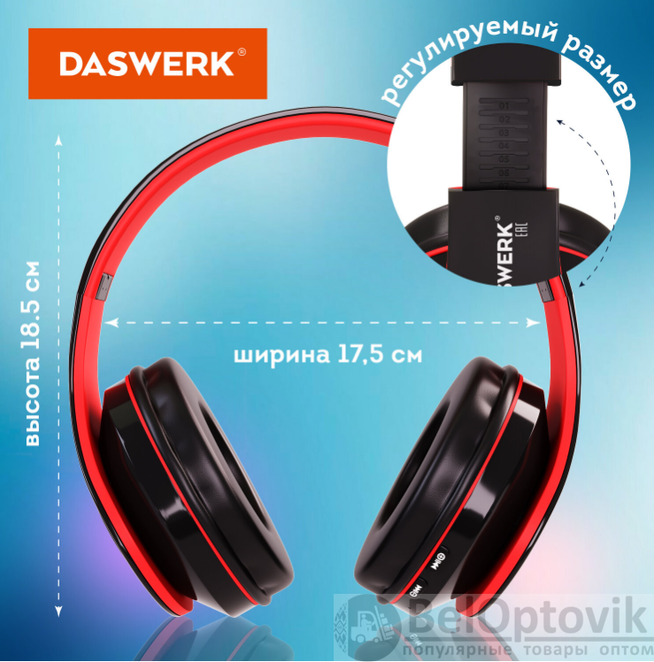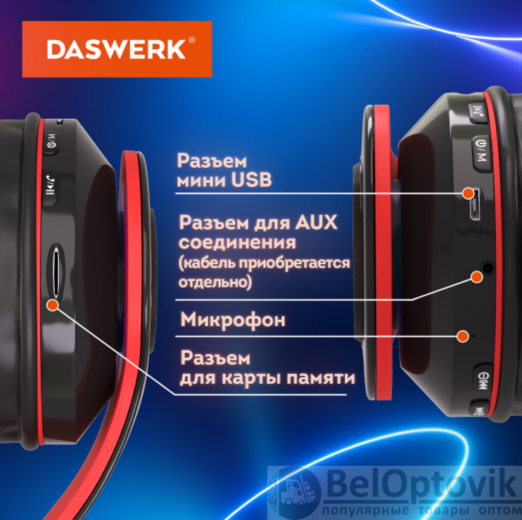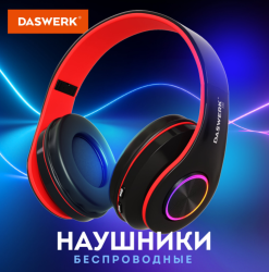 Беспроводные наушники DASWERK с подсветкой - это яркая и надёжная гарнитура. Слушай музыку, аудиокниги, играй!