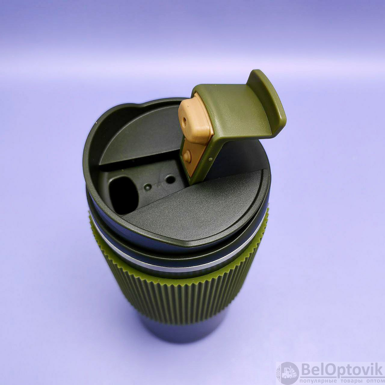 Силиконовая наружная вставка защищает от обжиганий - кружка не нагревается. Удобно и приятно держать в руках. В нижней части автостакана есть резиновая основа, благодаря которой предотвращается скольжение термокружки и обеспечивается стойкость. Флип-топ (откидная крышка) надежно зафиксируется на другой стороне и можно не беспокоиться о том, что она будет мешать при питье.
