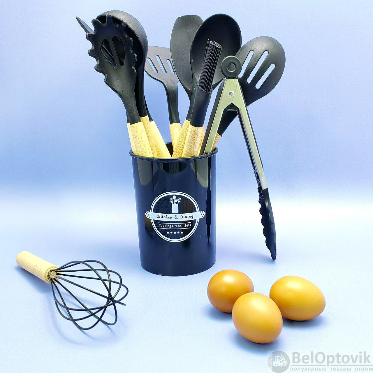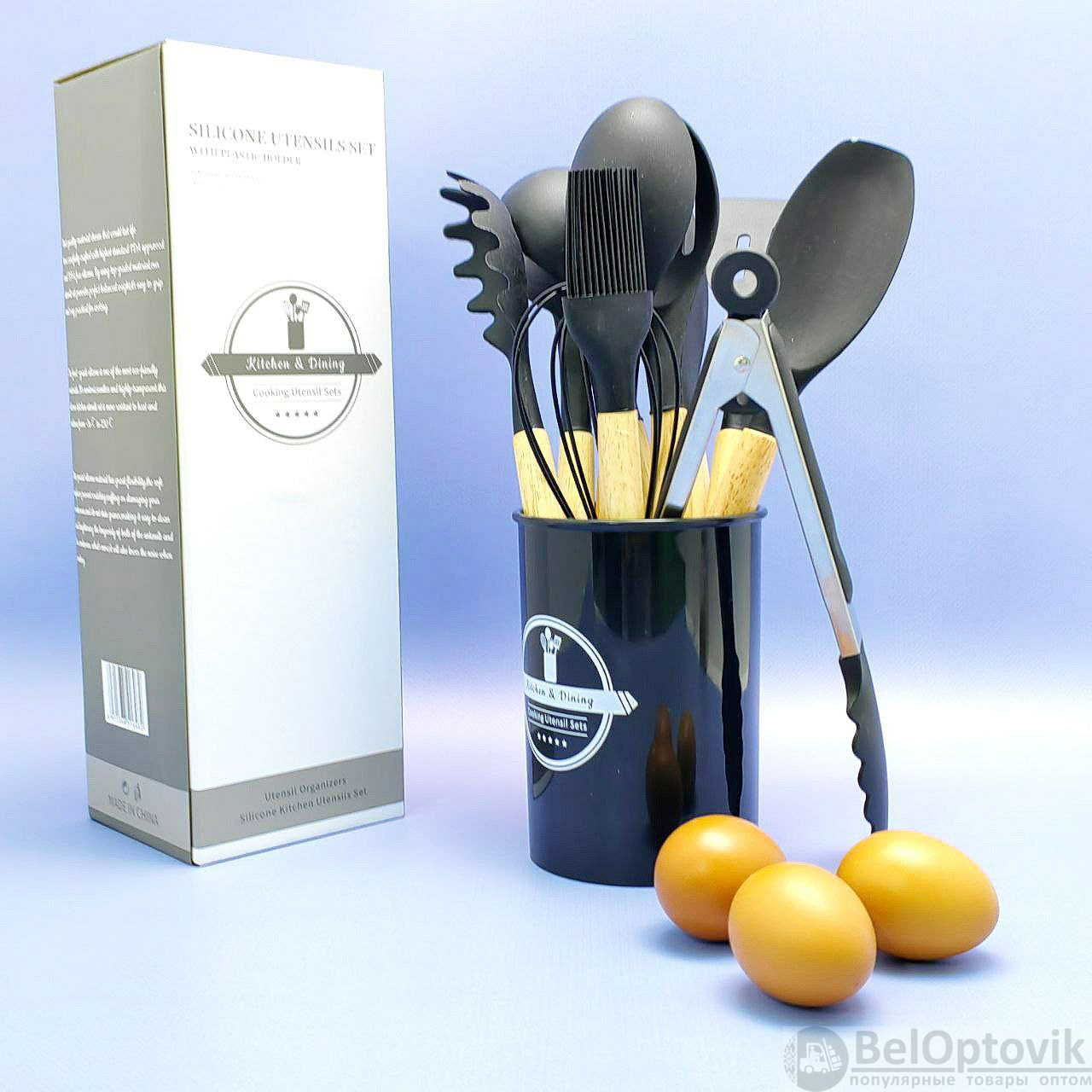 Что такое Набор кухонных принадлежностей с подставкой и деревянной ручкой 12 предметов Utensils Set / Подарочный силиконовый набор