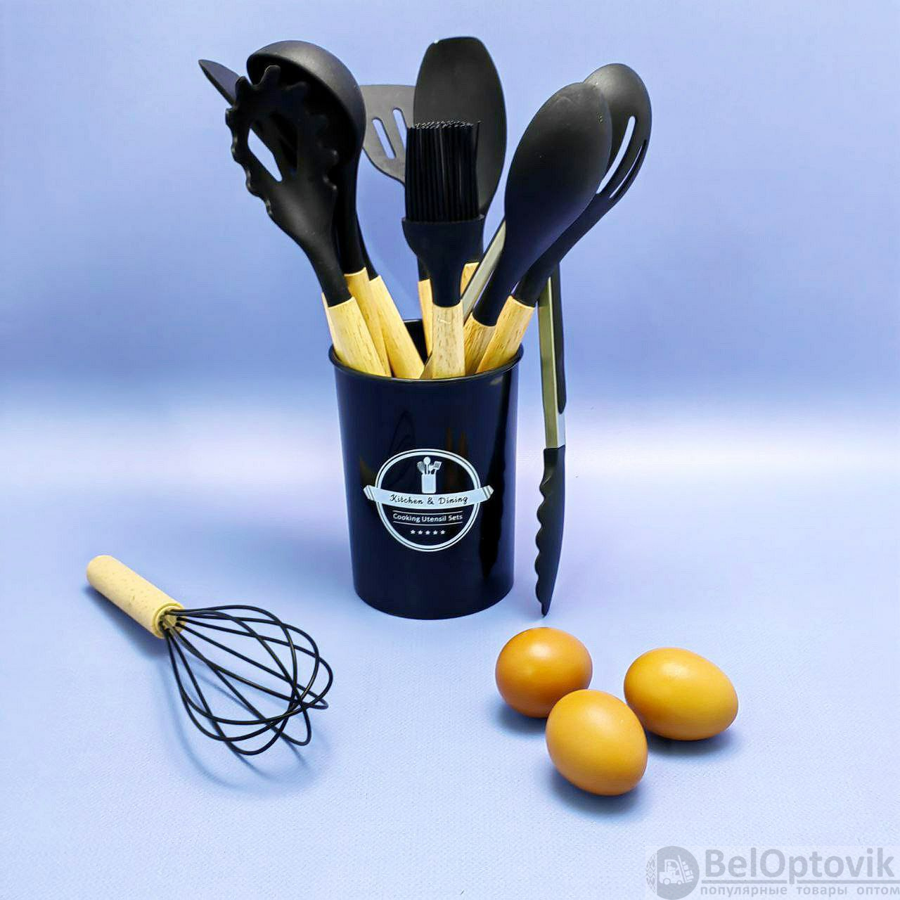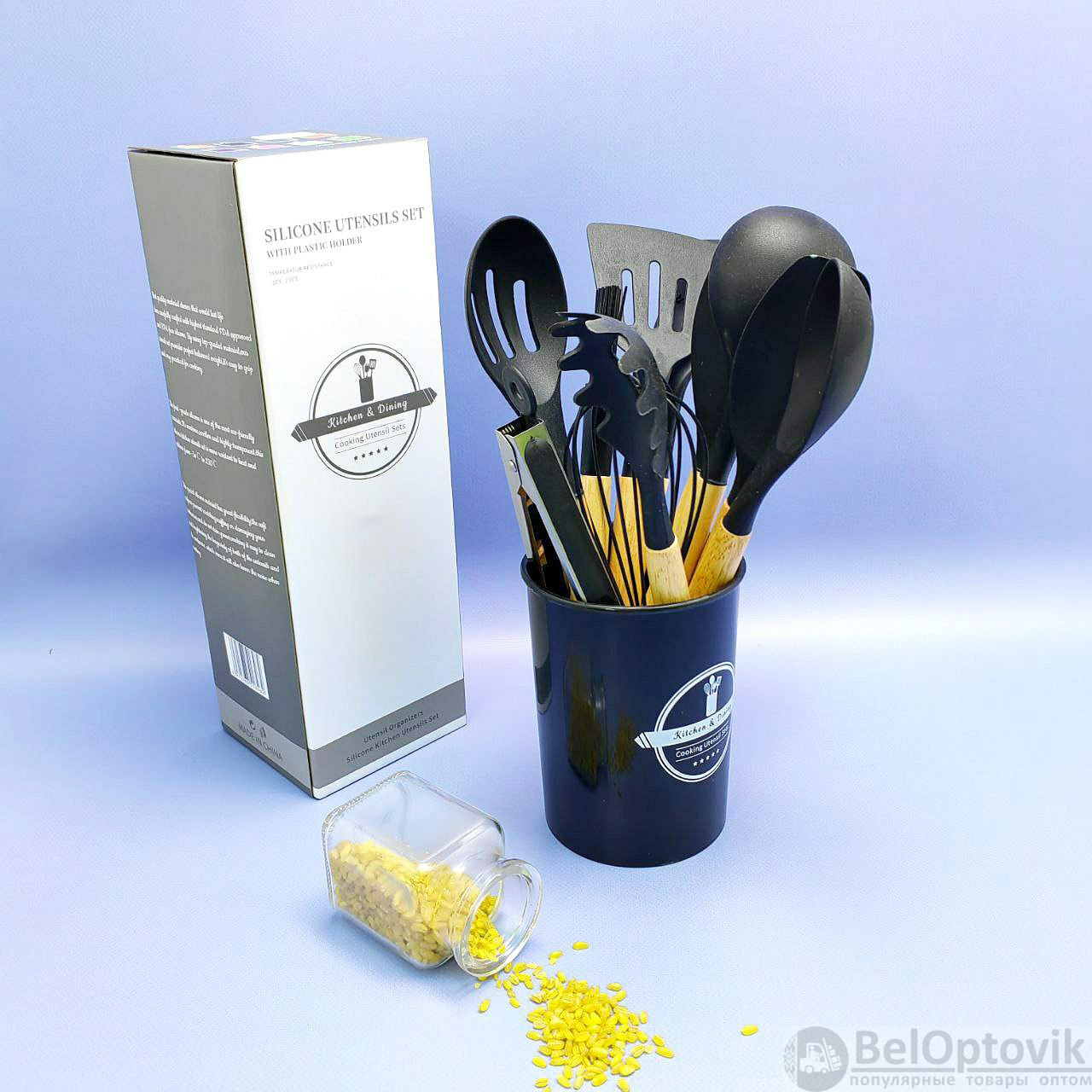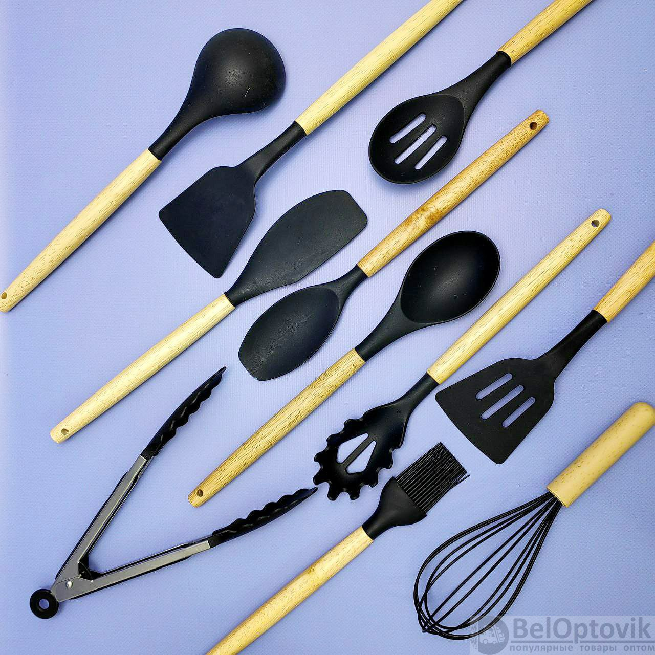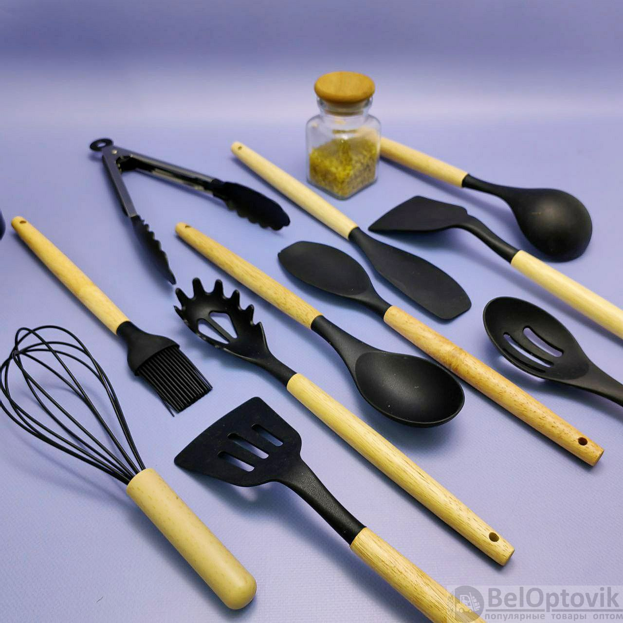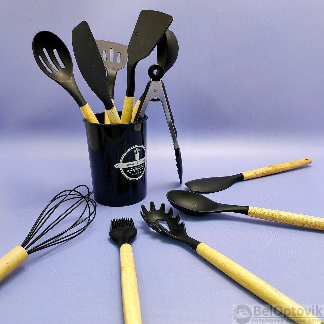 Набор кухонных принадлежностей с подставкой и деревянной ручкой 12 предметов Utensils Set / Подарочный силиконовый набор, Черный цвет