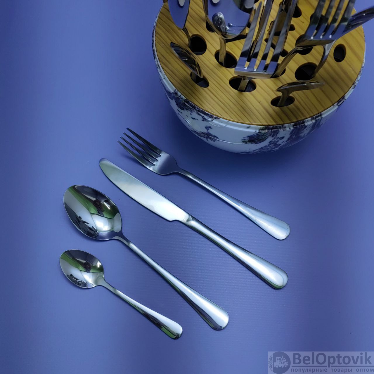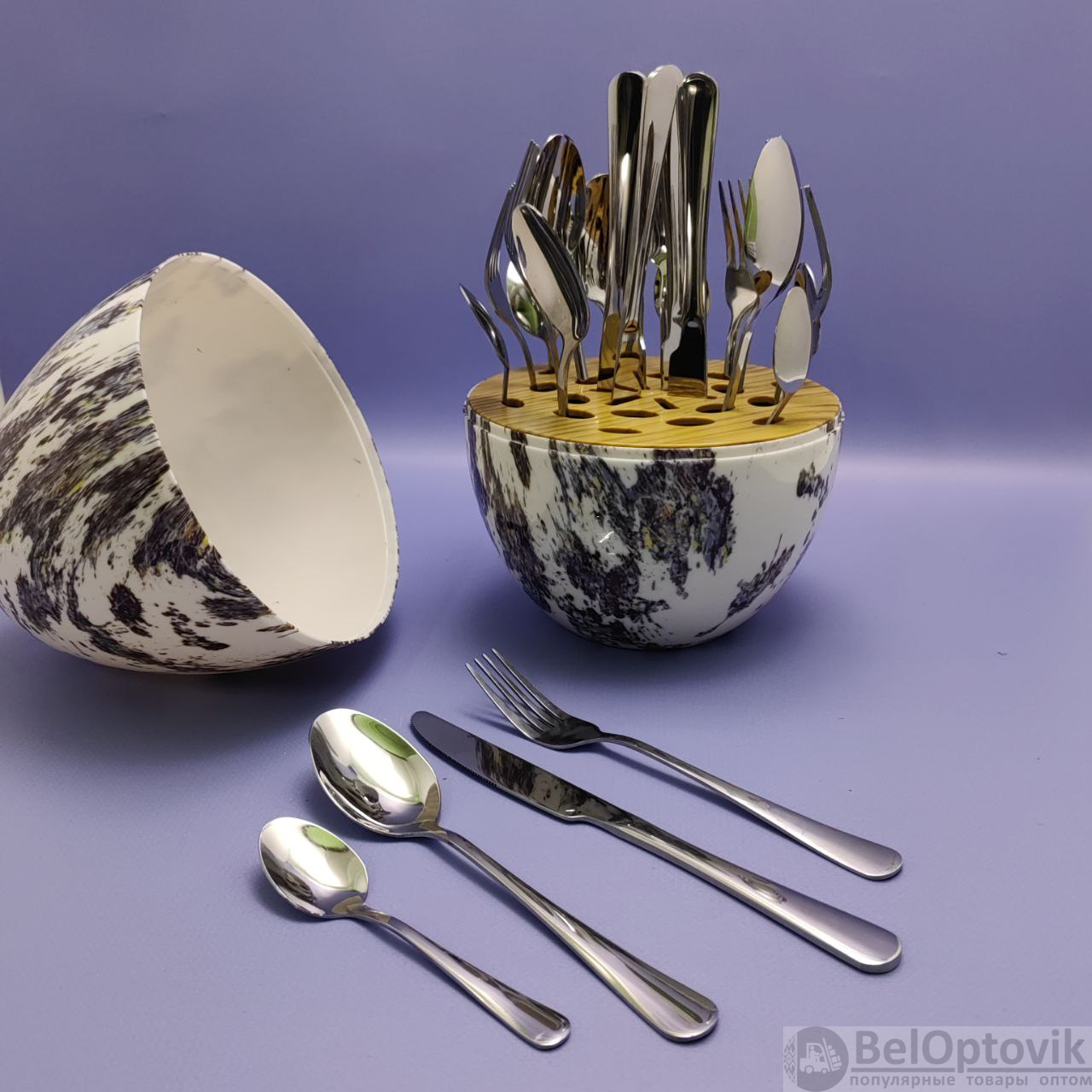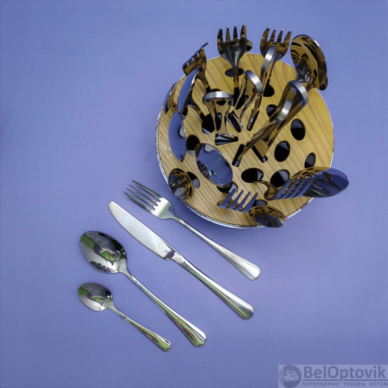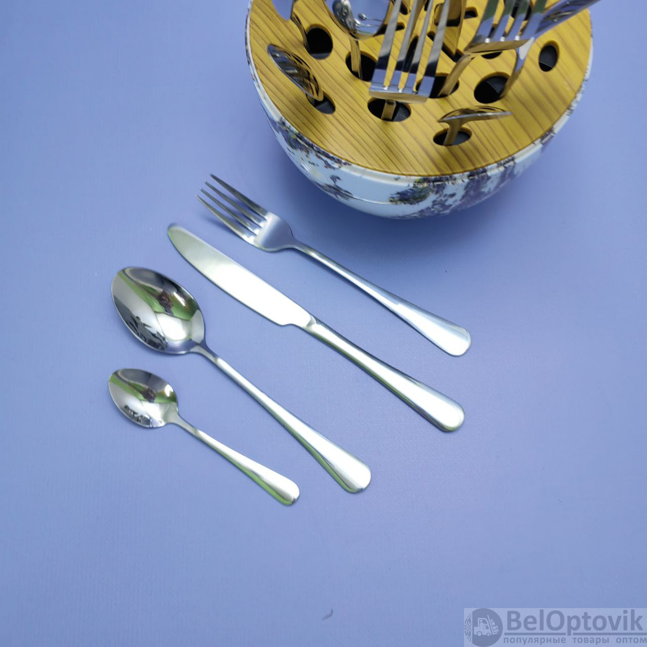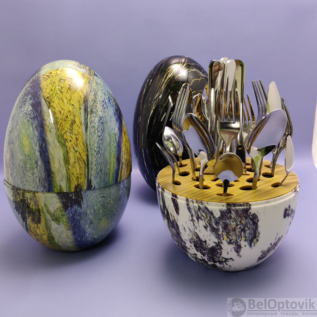 Комплект кухонных принадлежностей из 24 предметов на подставке в виде яйца, куда входят красивые столовые ложки и вилки, чайные ложки и столовые ножи из нержавеющей стали- станет роскошным дополнением для сервировки как праздничного, так и ежедневного стола дома и для великолепного и удивительного подарка. Подарочный глянцевый набор столовых предметов выполнен из качественной пищевой нержавеющей стали, которая не имеет запаха, не отдает металлическим привкусом, сохраняя свой неизменный вид в течение долгого срока службы. Столовые приборы можно мыть в посудомоечной машине.