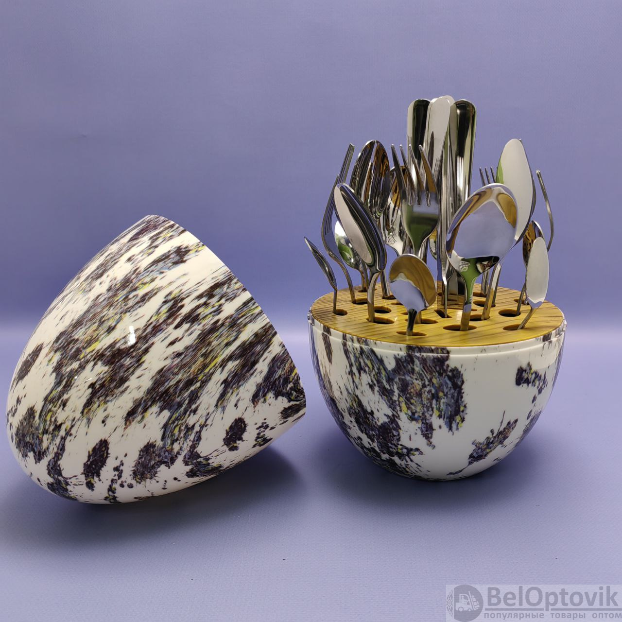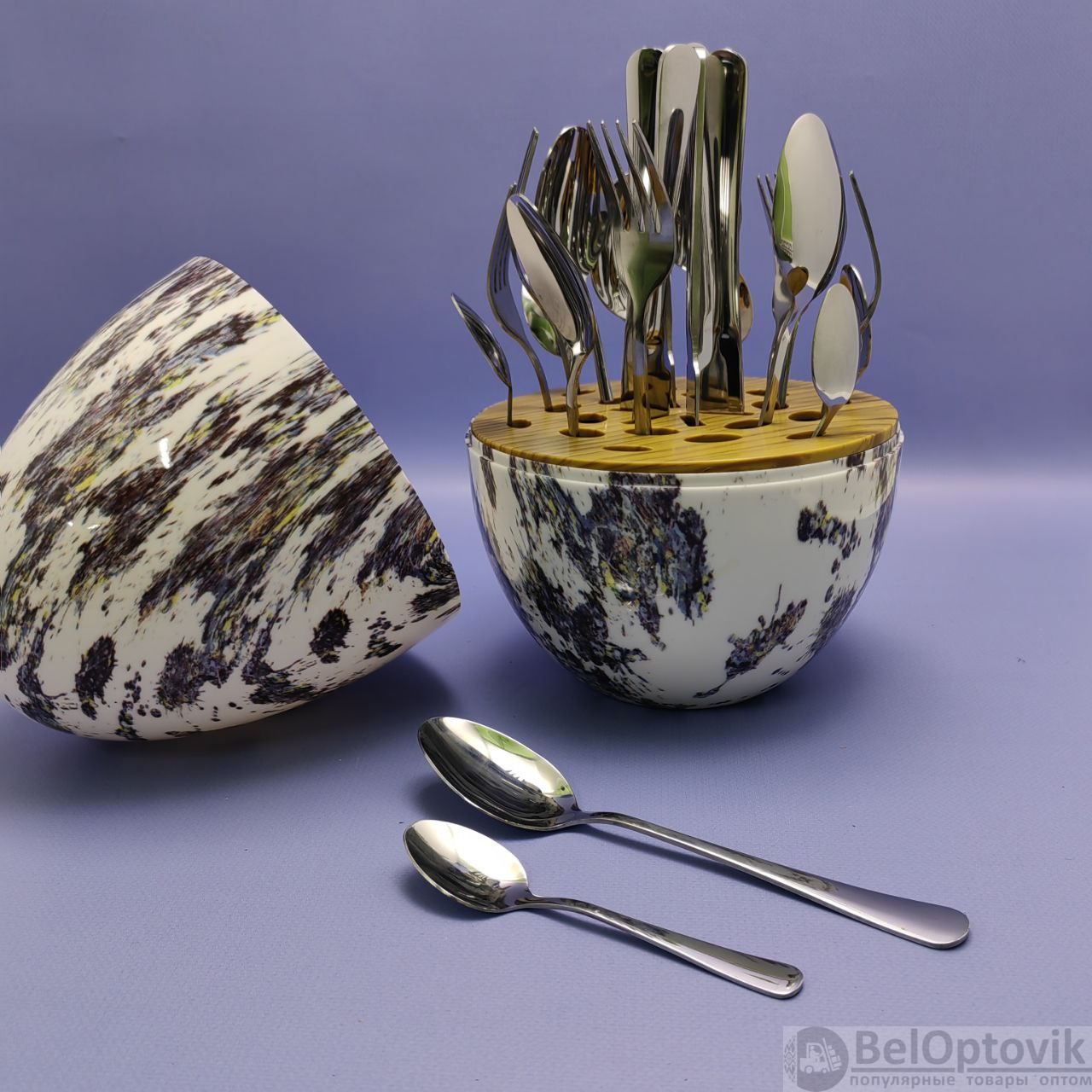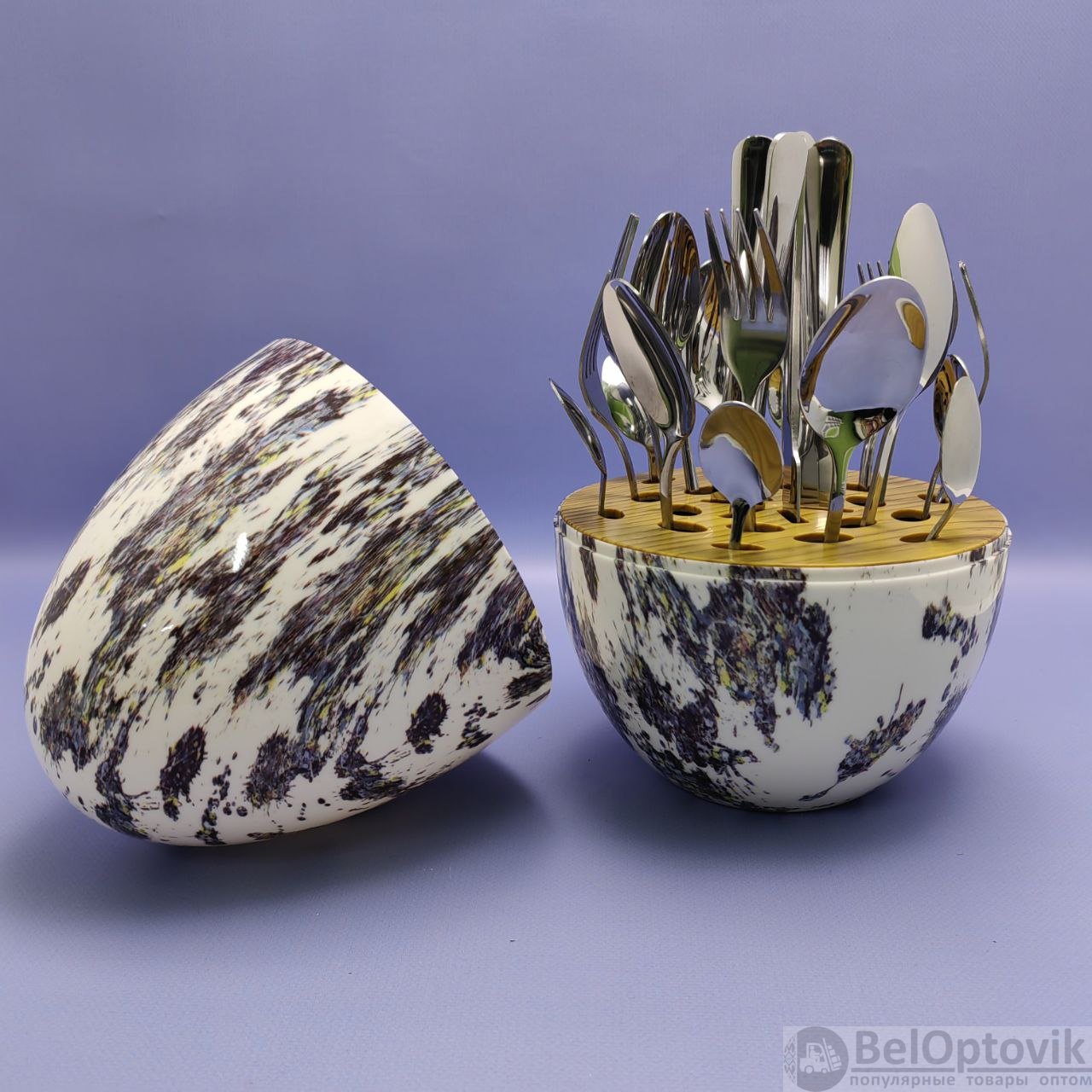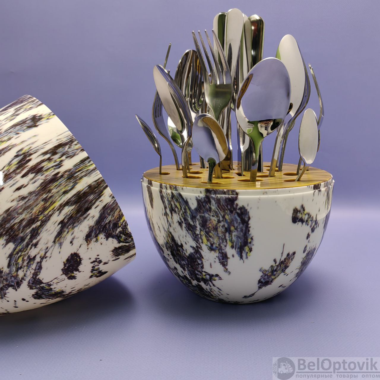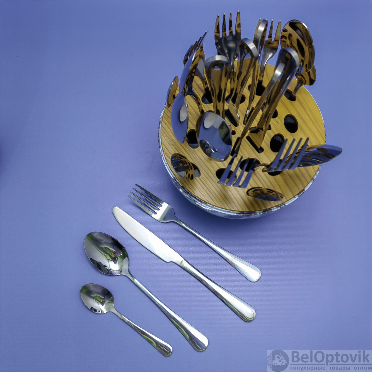 Комплект кухонных принадлежностей из 24 предметов на подставке в виде яйца, куда входят красивые столовые ложки и вилки, чайные ложки и столовые ножи из нержавеющей стали- станет роскошным дополнением для сервировки как праздничного, так и ежедневного стола дома и для великолепного и удивительного подарка. Подарочный глянцевый набор столовых предметов выполнен из качественной пищевой нержавеющей стали, которая не имеет запаха, не отдает металлическим привкусом, сохраняя свой неизменный вид в течение долгого срока службы. Столовые приборы можно мыть в посудомоечной машине.