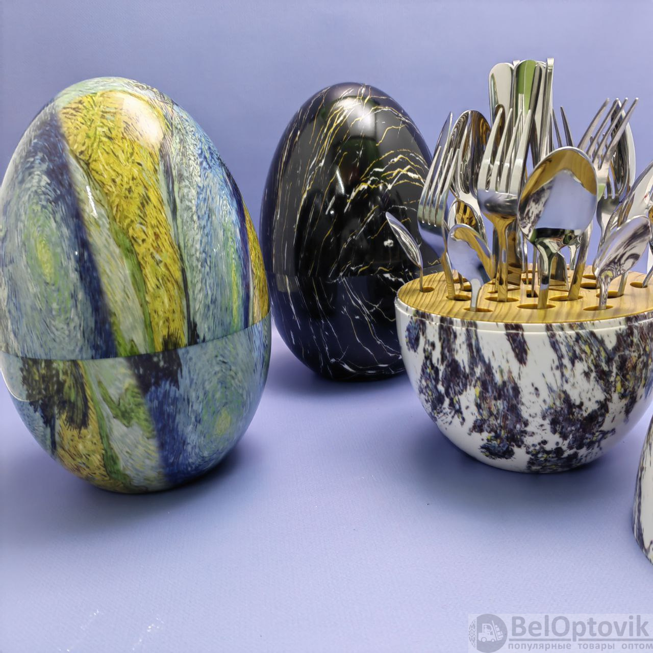 Подставка-яйцо- это больше, чем простой набор столовых приборов, это настоящий декоративный объект, который приносит сияние на кухне или гостиной. Декоративно расписанный футляр-яйцо полированный с внутренним прочным пластиковым диском (имитацией орехового дерева), который удерживает приборы в вертикальном положении- красота и многофункциональность подставки видна с первого взгляда! Сам футляр исполнен в трех вариантах – белый мрамор, черный мрамор и самый необычный футляр-лунная радуга. Превратите повседневную жизнь в высокое искусство благодаря изысканному аксессуару. Набор является отличным подарком как для любителей застольных и душевных посиделок так и для семейных тихих вечеров! И уж точно набор сможет украсить любую кухню или гостиную!