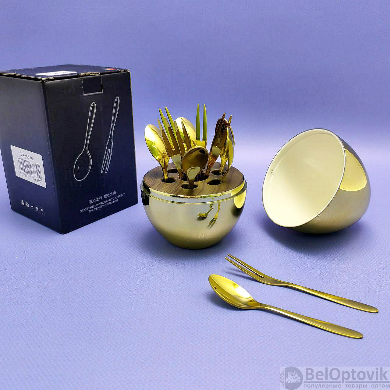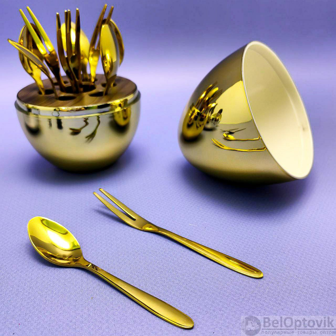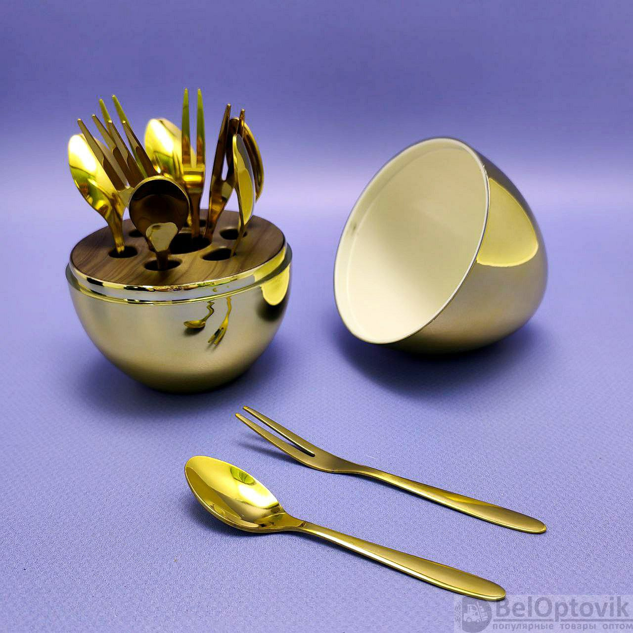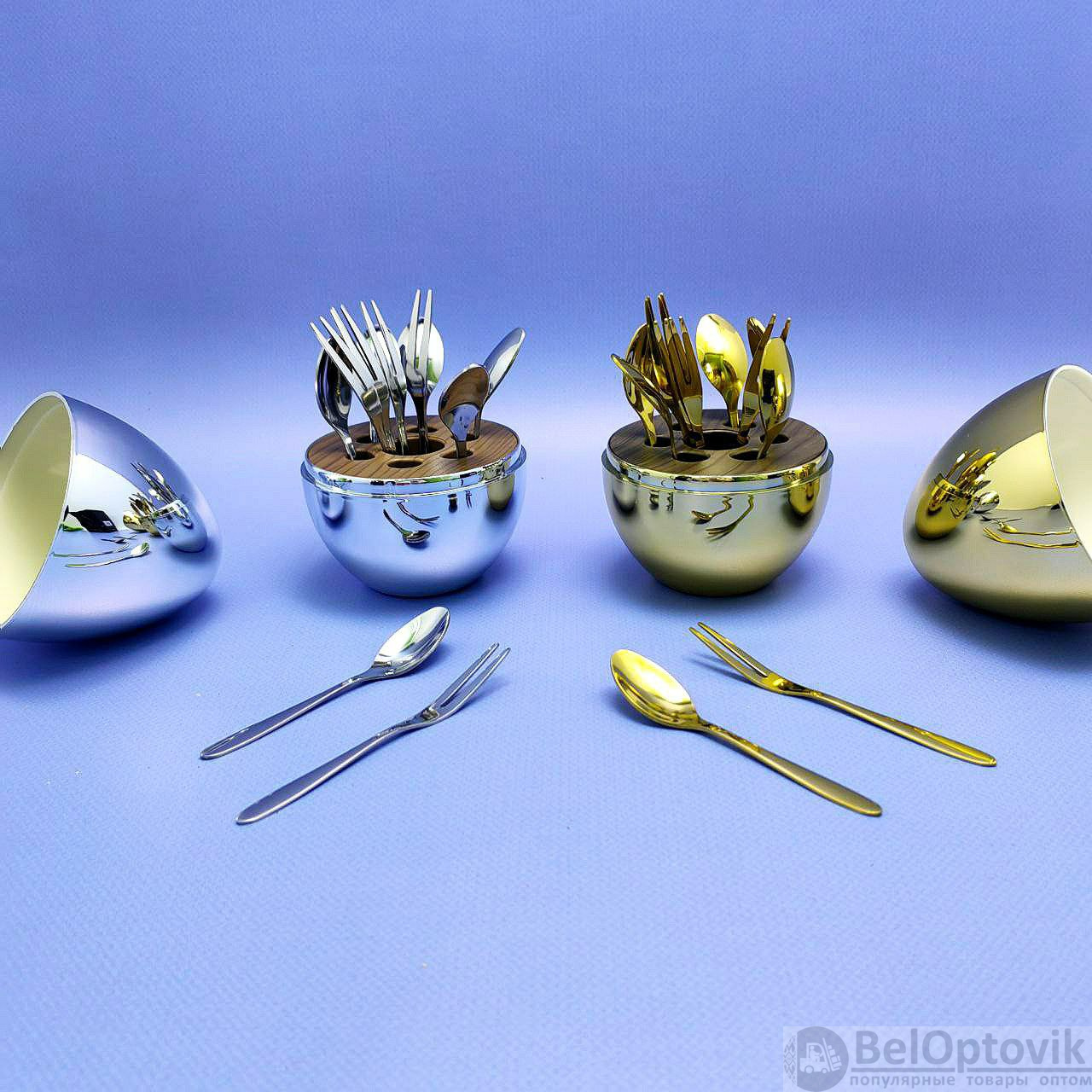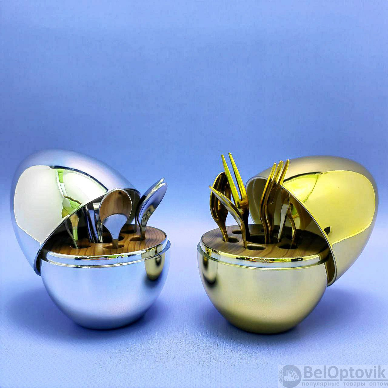 Комплект кухонных принадлежностей из 12 предметов на подставке в виде яйца, куда входят красивые ложки и вилки серебряного или золотого цвета- станет роскошным дополнением для сервировки как праздничного, так и ежедневного стола дома. Подарочный глянцевый набор столовых предметов выполнен из качественной пищевой нержавейки, которая не имеет запаха, не отдает металлическим привкусом, сохраняя свой неизменный вид в течение долгого срока службы.