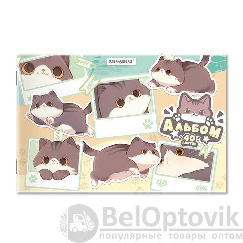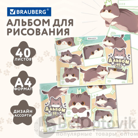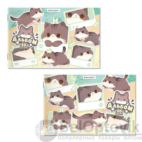 Альбом для рисования А4 40 л., скоба, обложка картон, BRAUBERG, 203х288 мм, кросс-серия "МИЛЫЕ КОТЫ", 107351