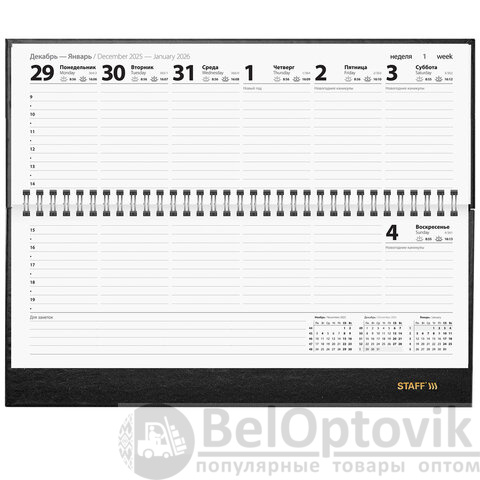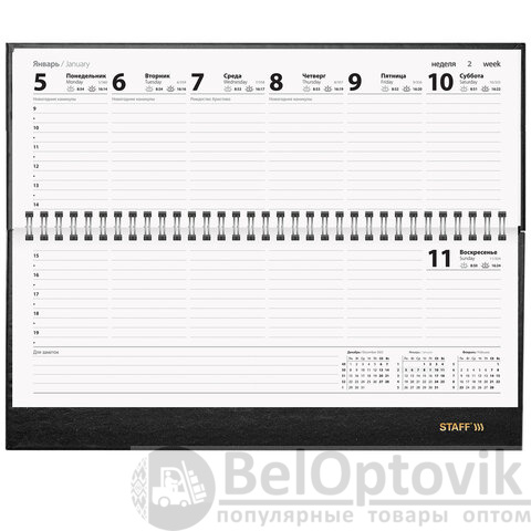 В датированном планинге STAFF все дни недели расположены на одном развороте, благодаря чему очень удобно планировать важные дела на неделю вперед.