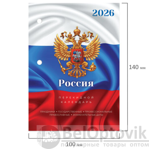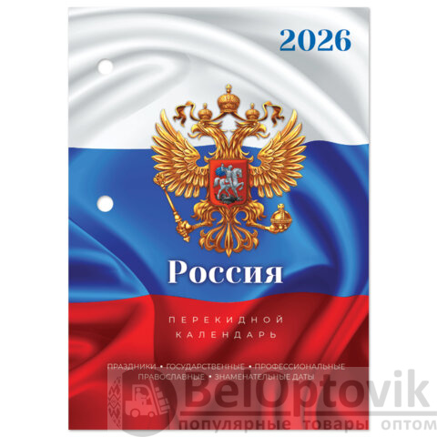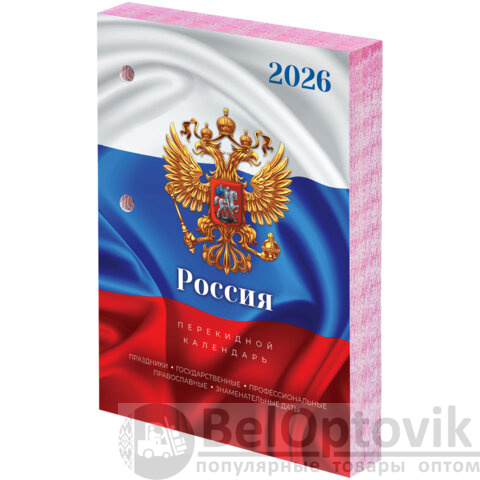 Блок календаря на 2026 год напечатан на офсетной бумаге плотностью 60 г/м2 в две краски с выделением цветом выходных и праздничных дней. Справочная информация на 160 листах: календарь на текущий месяц, часы восхода и захода солнца, долгота дня, лунный календарь, праздники.