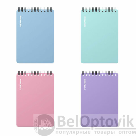 Блокнот формата А6 (102х146 мм). Обложка из высококачественного износостойкого матового пластика с фактурой "песок". В блоке 80 листов в клетку. Бумага офсетная плотностью 60 г/м2. Цвет линовки – синий. Скругленные уголки обложки. Тип скрепления – спираль. Блокноты разного цвета упакованы в термоусадочную пленку по 4 штуки.