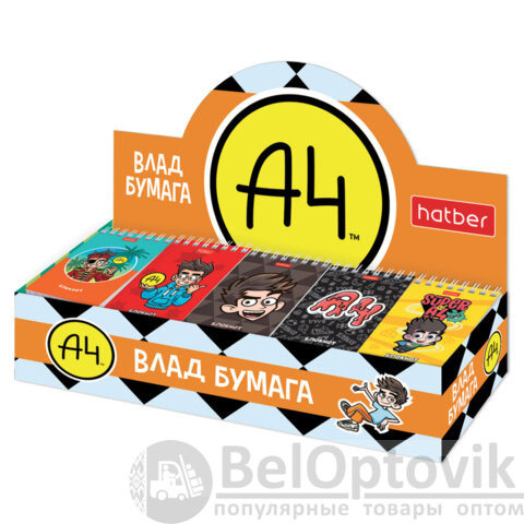 Блокнот МАЛЫЙ ФОРМАТ А7, 40 л., гребень, картон, клетка, дисплей, HATBER, Ассорти "Влад А4", 087487, 40Б7В1гр