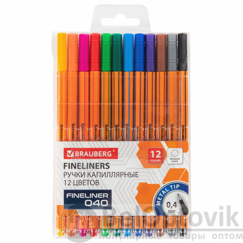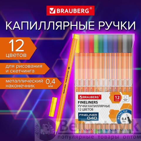 Ручки капиллярные (линеры) 12 ЦВЕТОВ, BRAUBERG "FINE 040", шестигранные, линия 0,4 мм, 144143