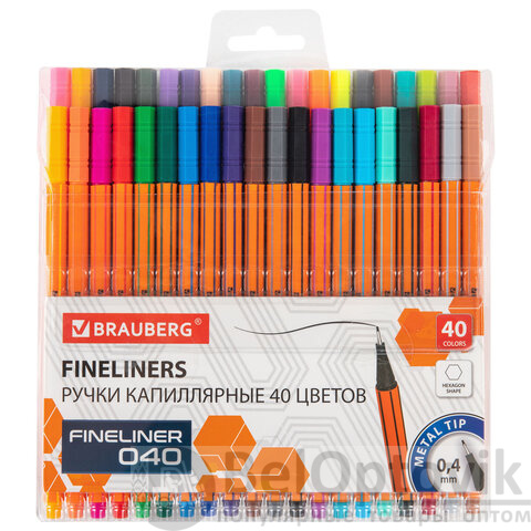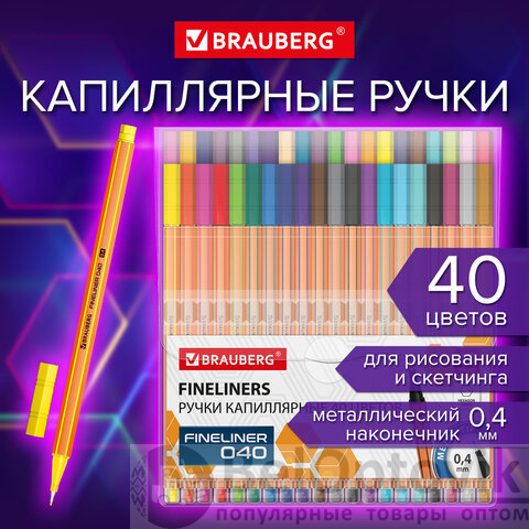 Набор капиллярных ручек BRAUBERG "FINE 040" состоит из 40 ярких цветов: желтый, оранжевый, розовый, красный, светло-зеленый, зеленый, голубой, синий, фиолетовый, коричневый, серый, черный, сиреневый, морская волна, небесно-голубой, мятный, черное дерево, винный, светло-серый, светло-коричневый, светло-розовый, темно-синий, пурпурный, темно-серый, баклажановый, сливовый, бежевый, сине-зеленый, виноградный, маджента, янтарный, светло-желтый, сине-серый, темно-коричневый, изумрудный, травяной, бледно-розовый.