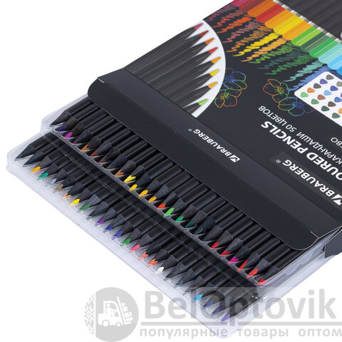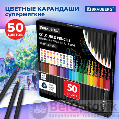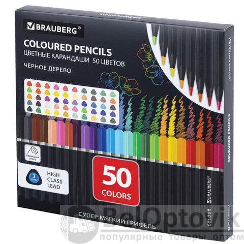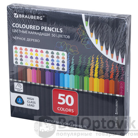 Карандаши цветные чёрное дерево BRAUBERG BLACK WOOD, 50 цветов, мягкий грифель 3 мм, 182043