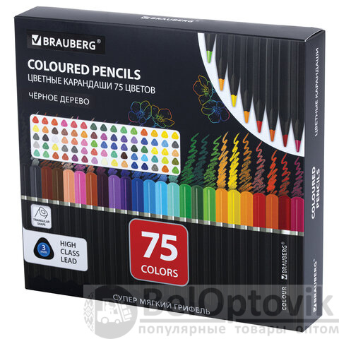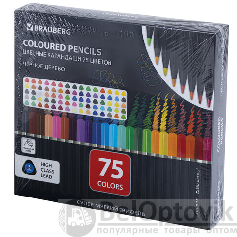 Карандаши цветные чёрное дерево BRAUBERG BLACK WOOD, 75 цветов, мягкий грифель 3 мм, 182044
