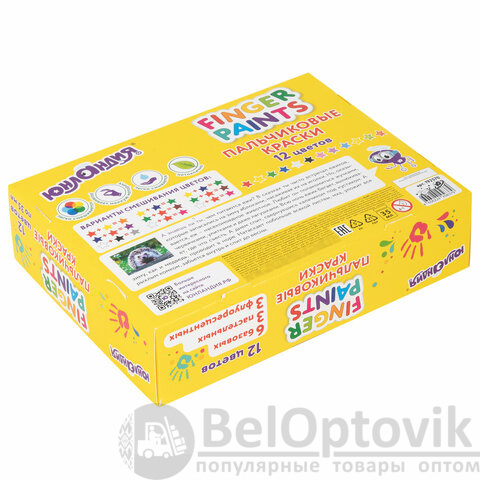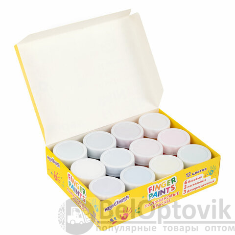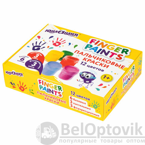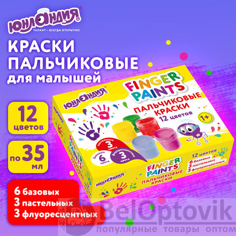 Краски пальчиковые для малышей от 1 года, 12 цветов (6 базовых + 3 пастельных + 3 флуоресцентных) по 35 мл, ЮНЛАНДИЯ, 192570