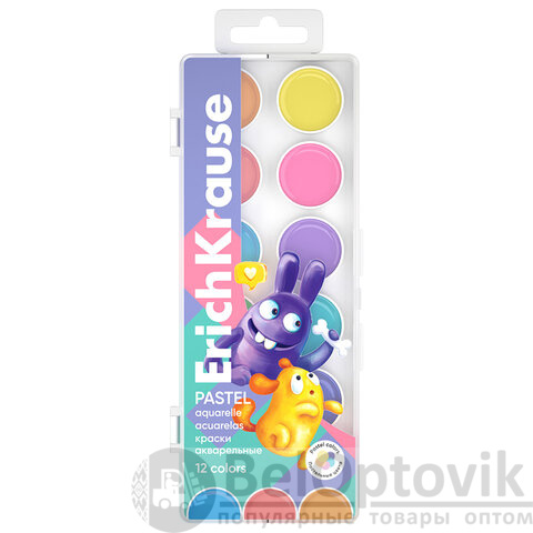 Краски акварельные ERICH KRAUSE "Jolly Friends Pastel", 12 цветов, пластиковый пенал, европодвес, 61370