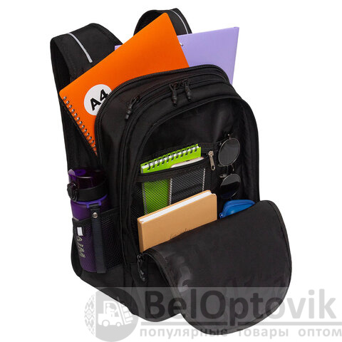 В рюкзаке 3 основных отделения: для книг или крупных вещей, для тетрадей, папок и документов формата А4, для разнообразных принадлежностей. Внутри располагается карман для ноутбука 13" и брелок для ключей. Есть внешний карман и 2 боковых сетчатых: для воды и ланч-бокса.