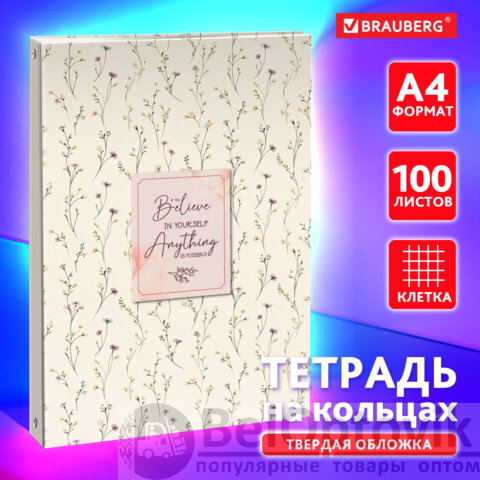 Тетрадь на кольцах БОЛЬШАЯ 210х305мм А4, 100л, обложка картон, клетка, BRAUBERG, Цветы, 405412