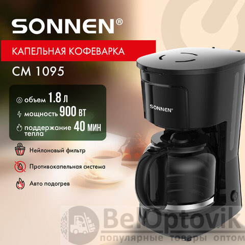 Кофеварка капельная SONNEN CM1095, 900 Вт, объем 1,8 л, подогрев кофе, противокапельная система, черная, 456334