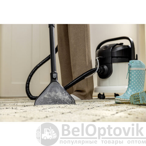 Моющий пылесос KARCHER SE 4, предназначенный для тщательной чистки текстильных и твердых напольных покрытий, работает по принципу распыления-экстракции и подходит как для сухой, так и для влажной уборки.