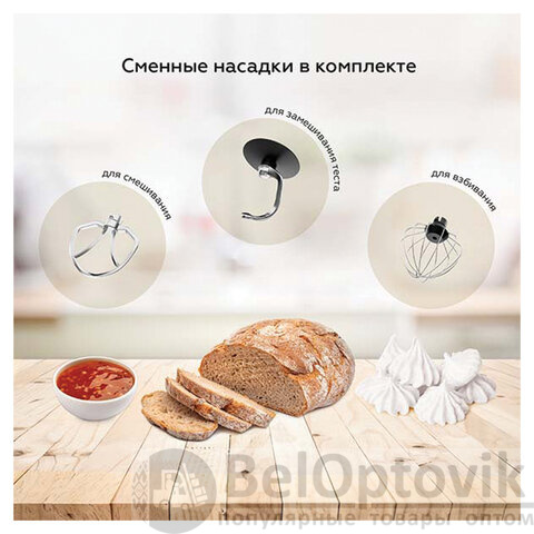 - Комплектация: насадка для взбивания, насадка для замеса густого теста, насадка для смешивания, съемная чаша