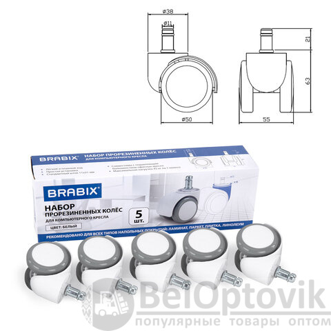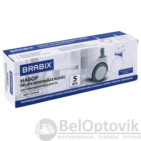 Колеса (ролики) BRABIX для кресла, прорезиненные, КОМПЛЕКТ 5 шт., шток d 11 мм, белые, в коробе, 533085