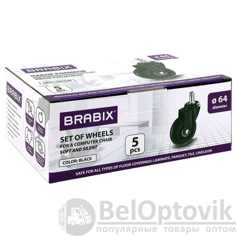 Колеса (ролики) BRABIX для кресла мягкие, резиновые, d 64 мм, КОМПЛЕКТ 5 шт., шток d 11 мм, в коробе, 533087