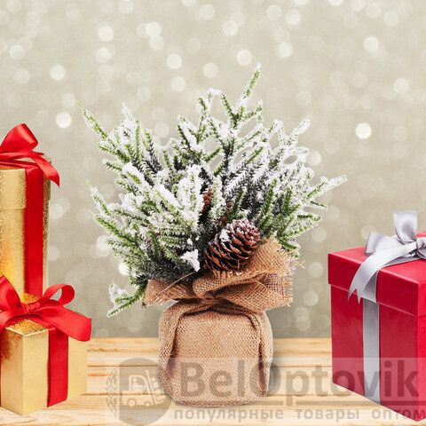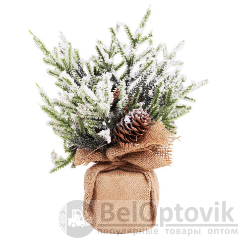 Ель искусственная настольная заснеженная с шишками высотой 34 см представляет собой конструкцию из металлического каркаса и закрепленных к нему ветвей.