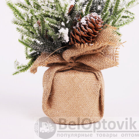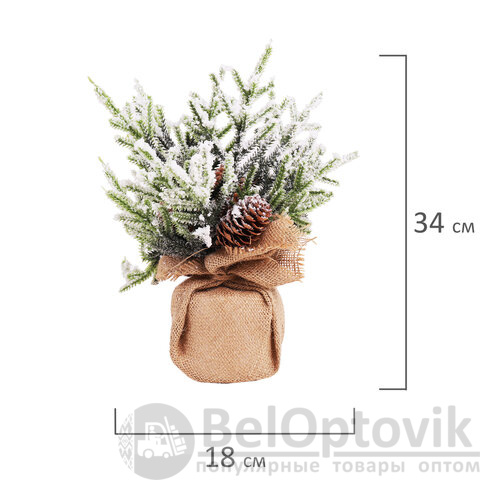 Материал – 100% литой ПЭТ. Цвет хвои – зелёный. Иголки украшены искусственным белым снегом и декоративными сосновыми шишками размером 3x4 см. Материал подставки – застывший цементный раствор, обёрнутый декоративной холщовой тканью. Высота ели – 34 см.