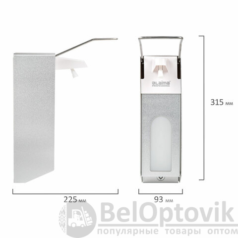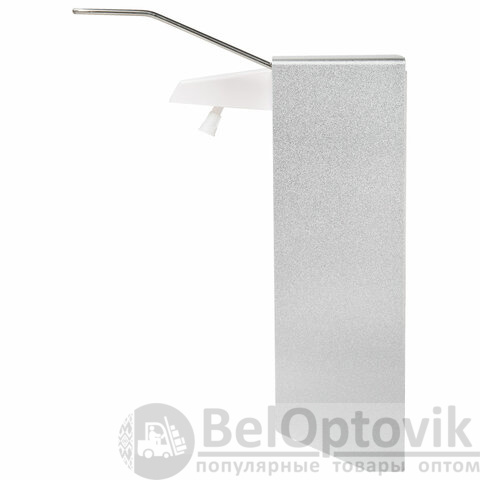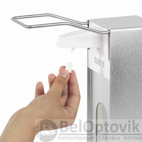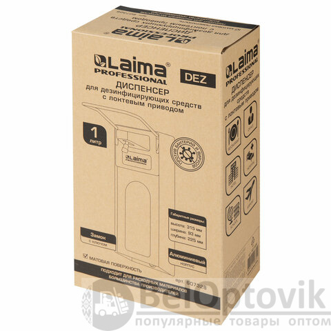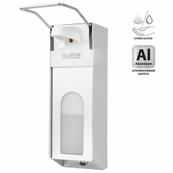 Наливной диспенсер имеет объем 1 л. Антивандальный корпус устройства выполнен из алюминия. Механизм подачи расходных материалов при помощи локтевого привода позволяет избежать контакта рук с поверхностью диспенсера. Выдача жидкого антисептика осуществляется экономичными порциями. Диспенсер сочетается с расходными материалами других производителей. В комплект входят крепежные элементы. Оборудован замком с ключом.