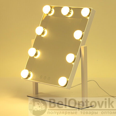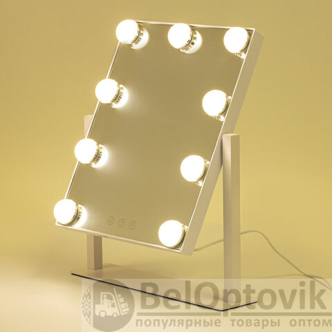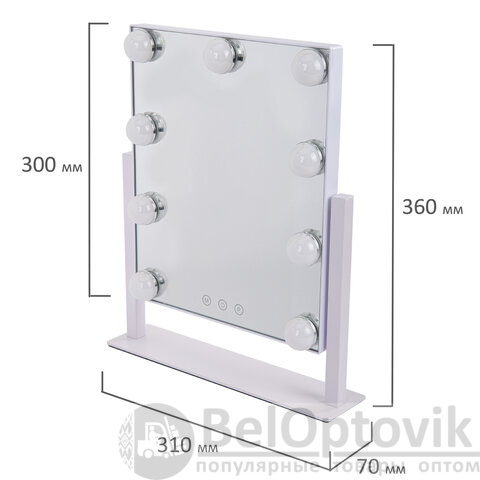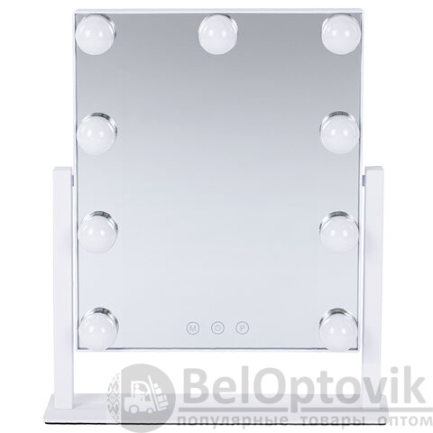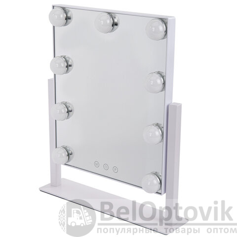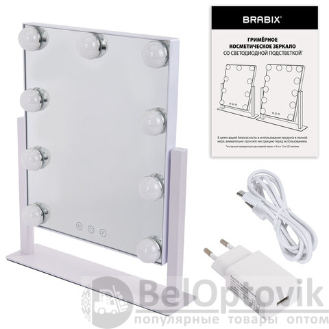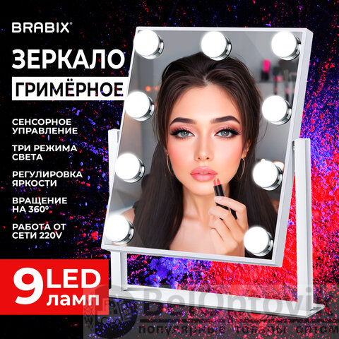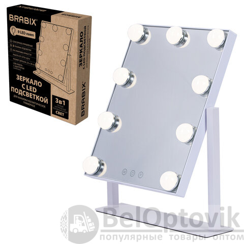 Зеркало для макияжа гримерное с подсветкой, 9 LED-ламп, 3 режима свечения, размер 25х30 см, работа от сети 220 V, цвет белый, BRABIX, 609335