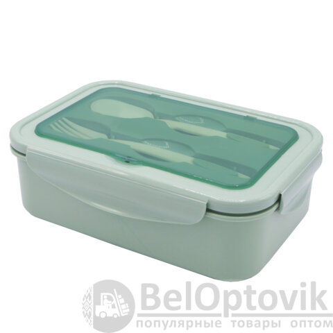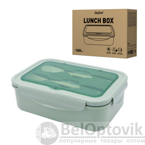 Ланч-бокс контейнер 2 секции 3+1 отделение 1,4л ложка, вилка 7х21х14см, мятный JOYLUX, 609347
